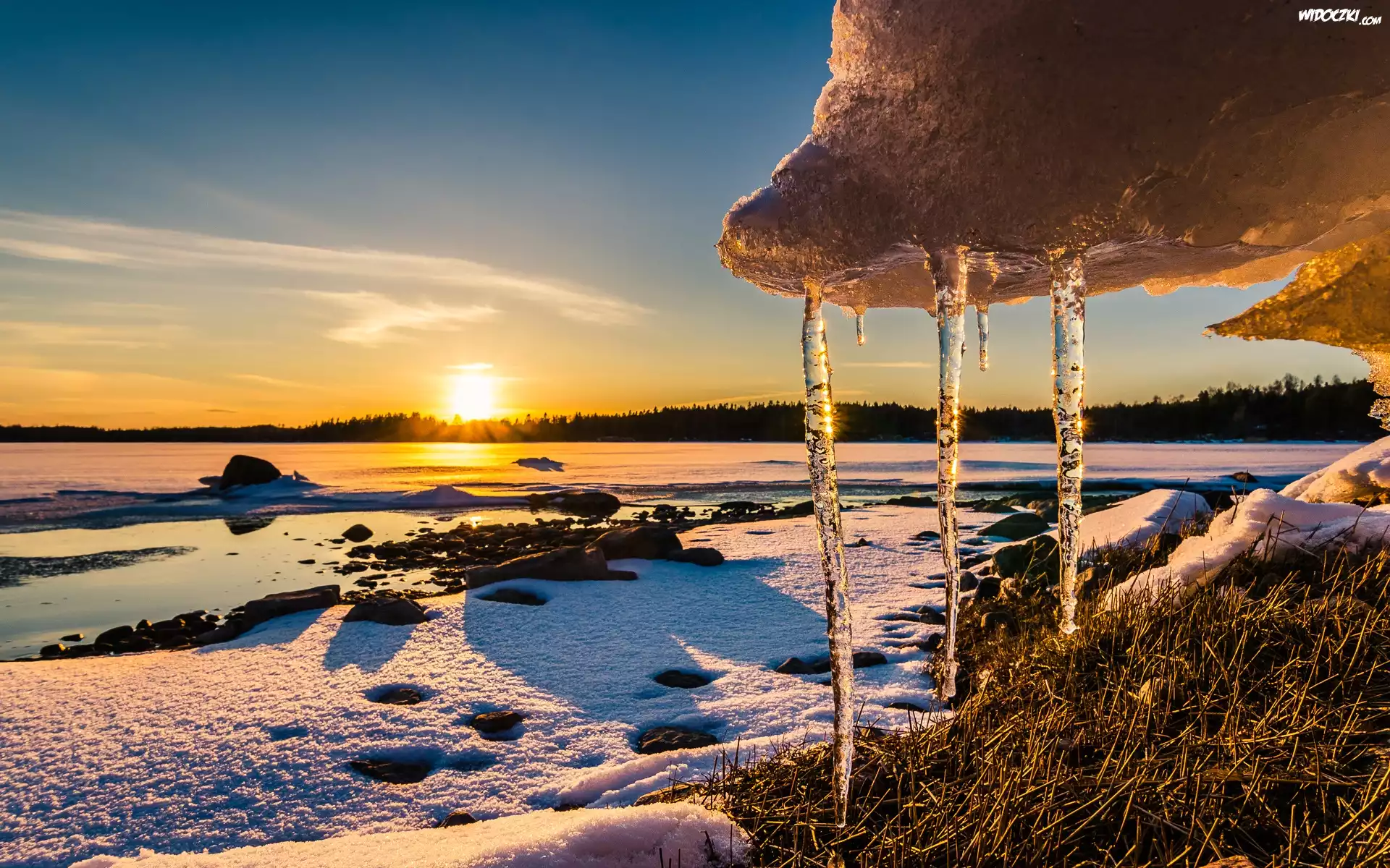 Zdjęcia, Zima, Wschód słońca, Sople, Śnieg