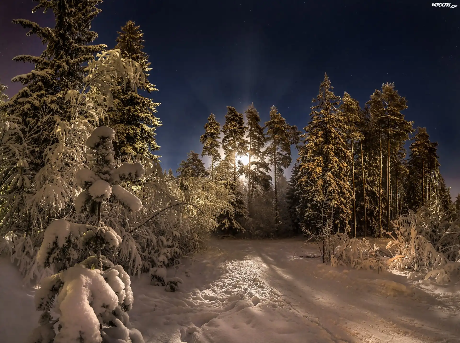 Zdj臋cia, Zima, Las, Sosny, Noc