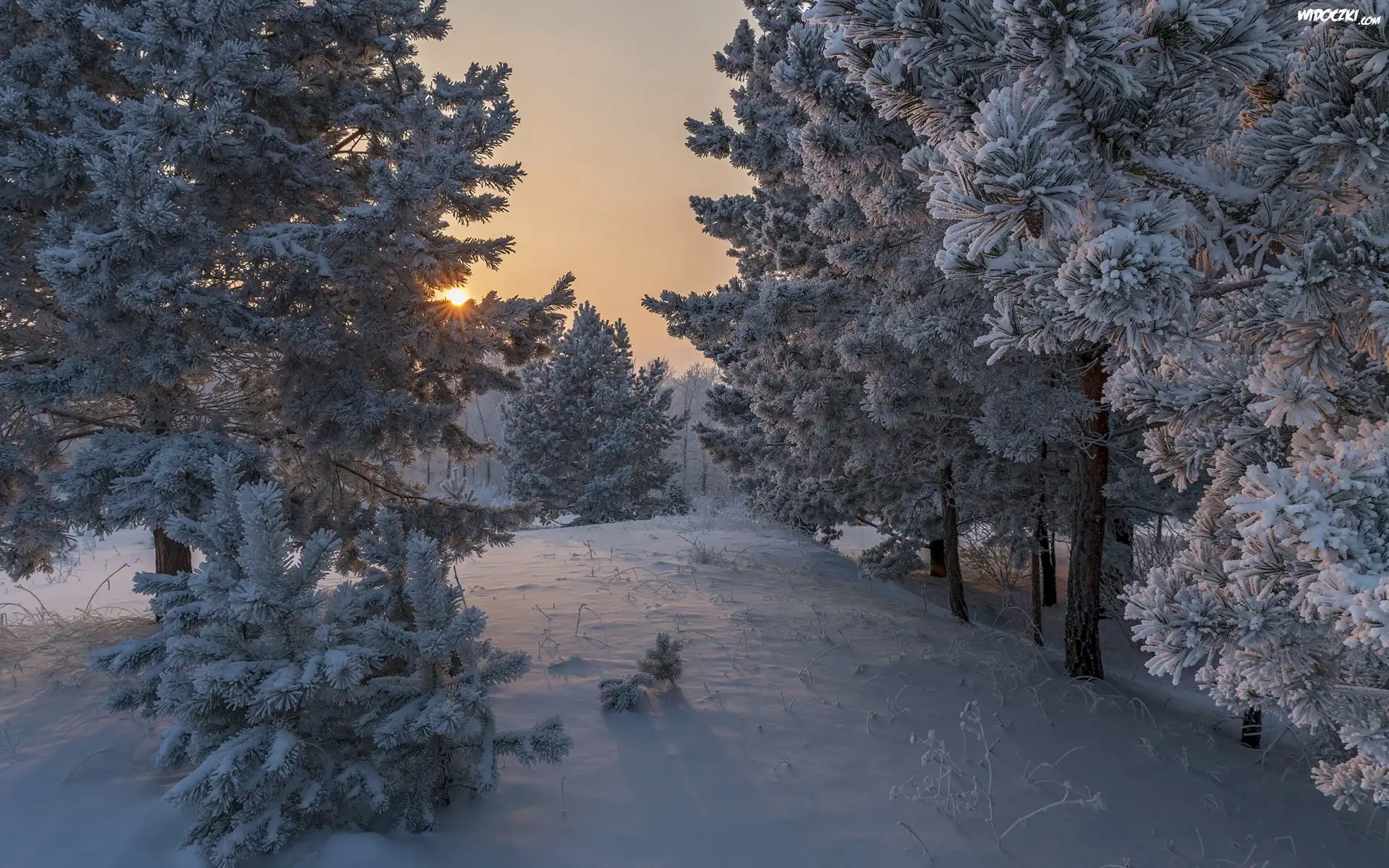 Zima, Wschód słońca, Drzewa, Sosny, Śnieg