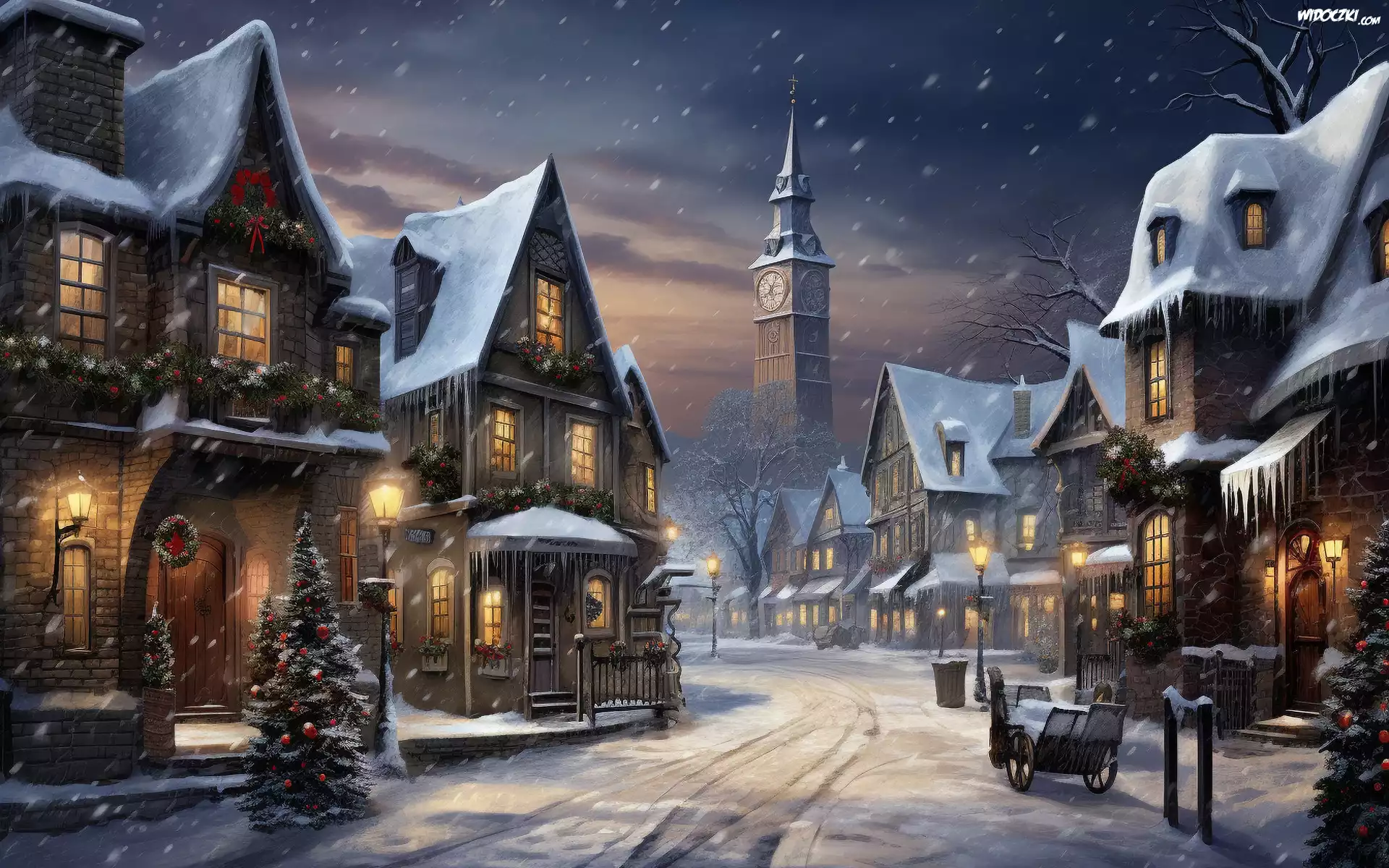 Zima, Ulica, Domy, Śnieg, Dekoracja, Noc, Światła, Choinka, Niebo