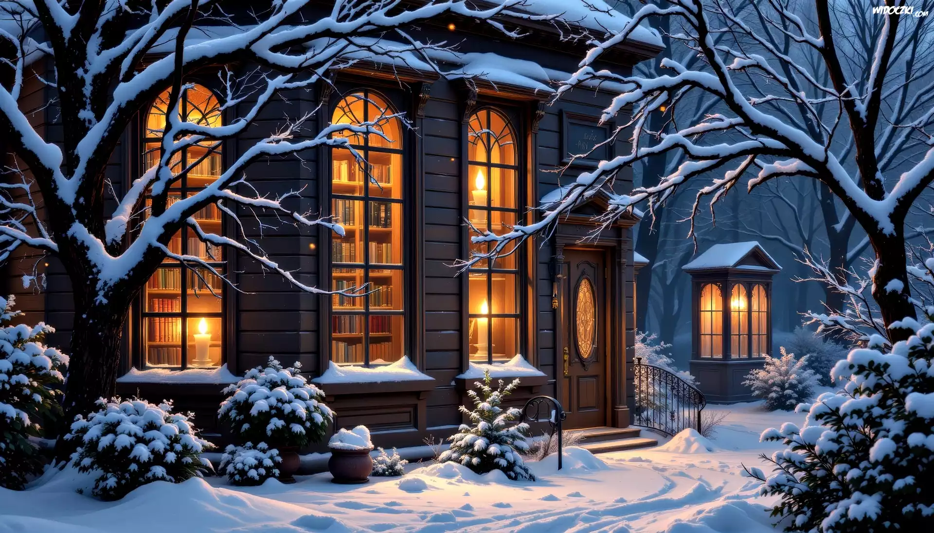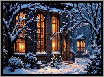 Zdjęcia, Dom, Biblioteka, Światło, Zima, Drzewa, Grafika AI