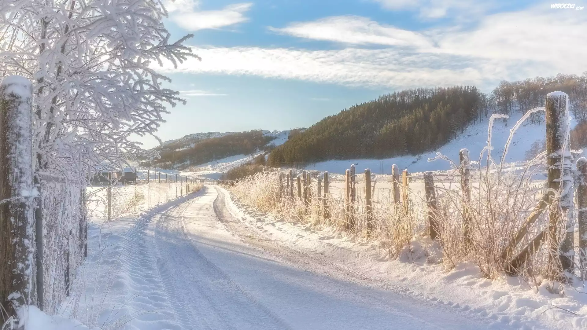 Zdjęcia, Zima, Droga, Drzewa, Ogrodzenie, Szron, Las