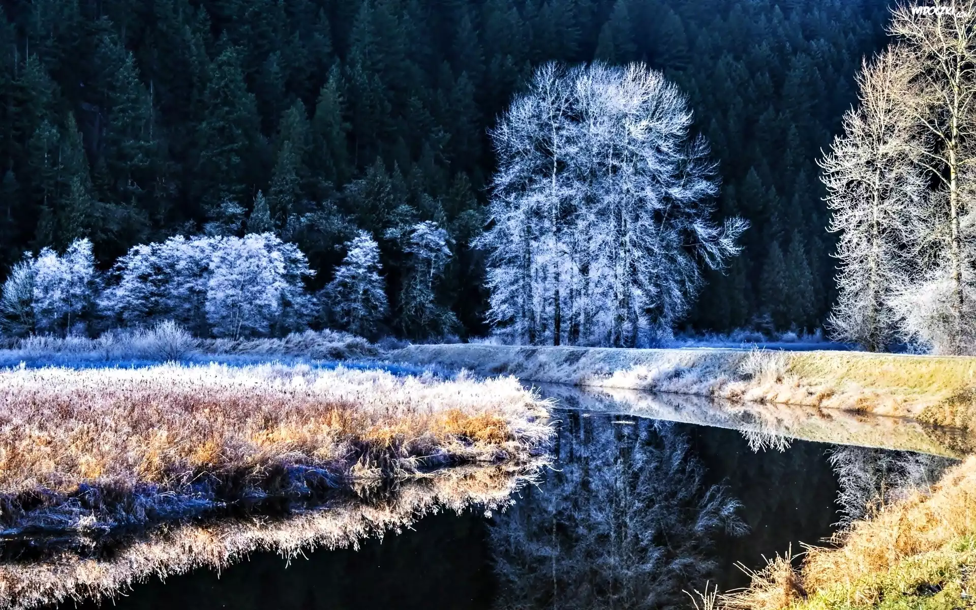Zima, Åšnieg, Rzeka, Drzewa, Szron, Noc