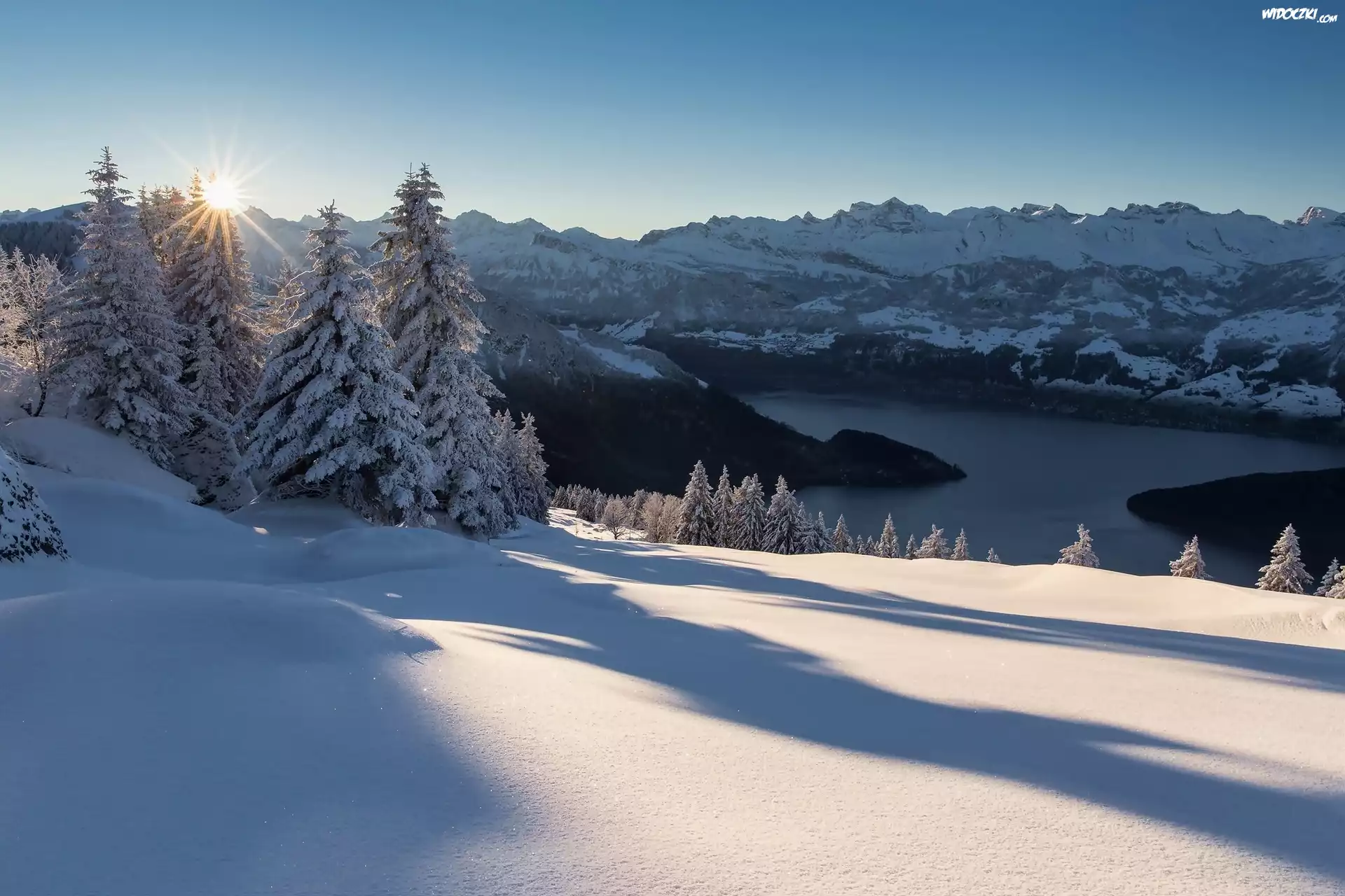 Zdjęcia, Szwajcaria, Zima, Góry, Alpy, Promienie słońca, Świerki