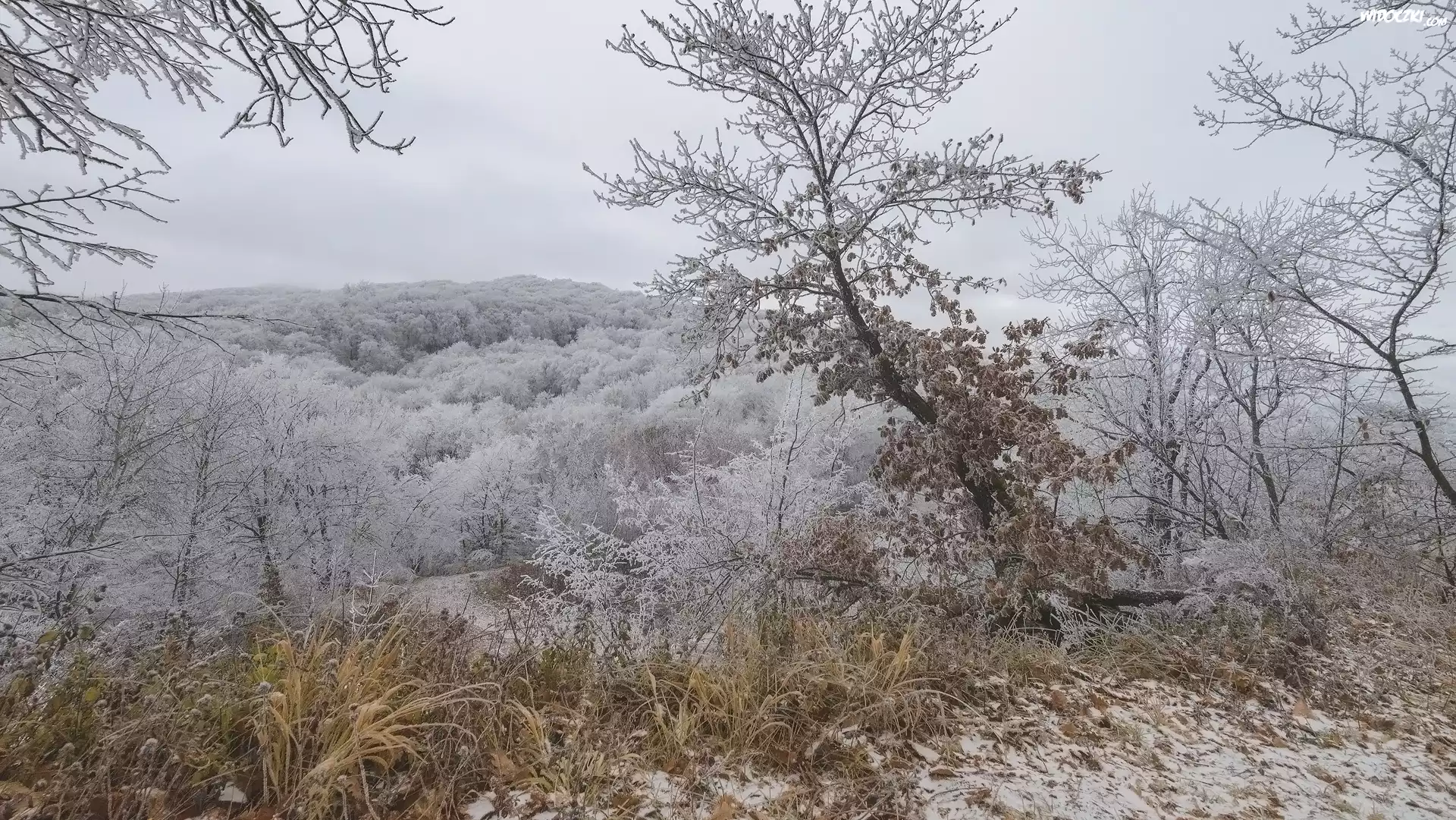 Zdjęcia, Zima, Drzewa, Trawa, Szron