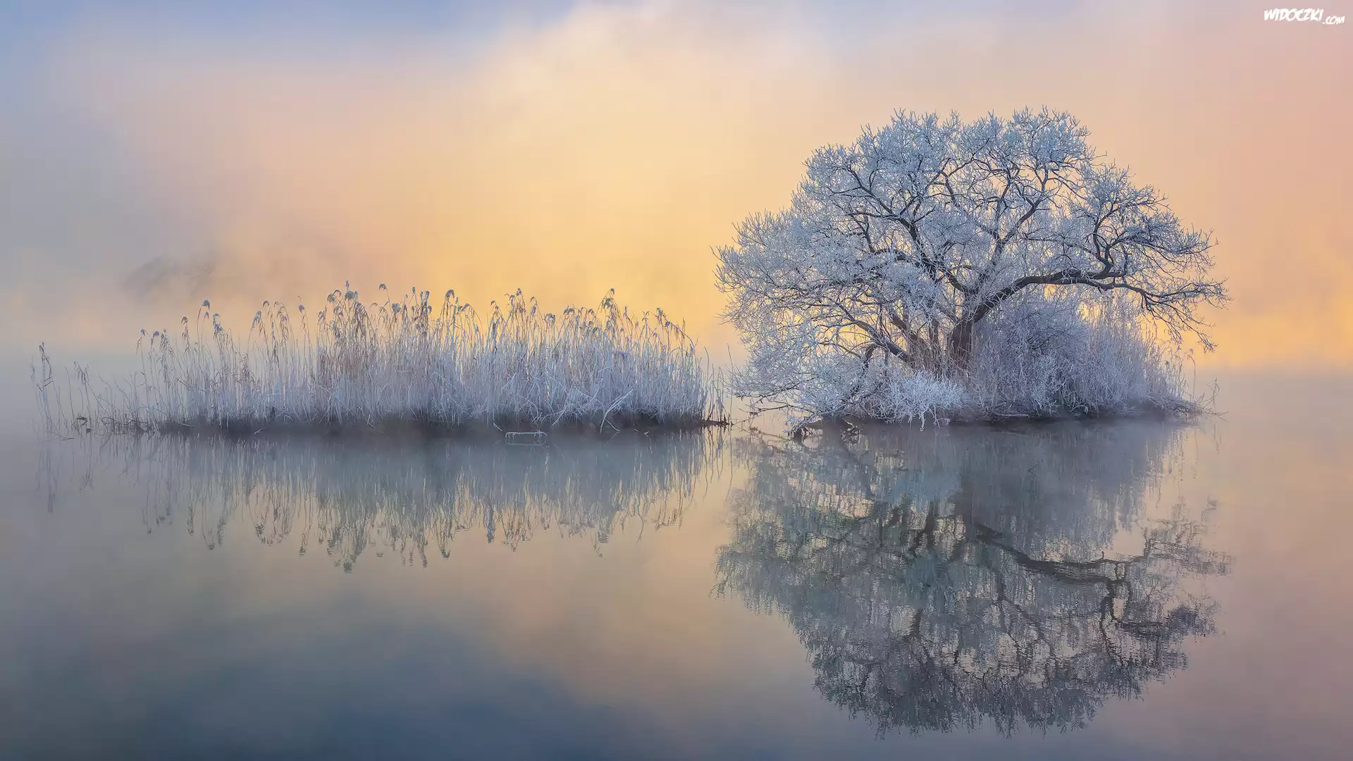 Zima, Szron, Drzewo, Mgła, Trawa, Odbicie