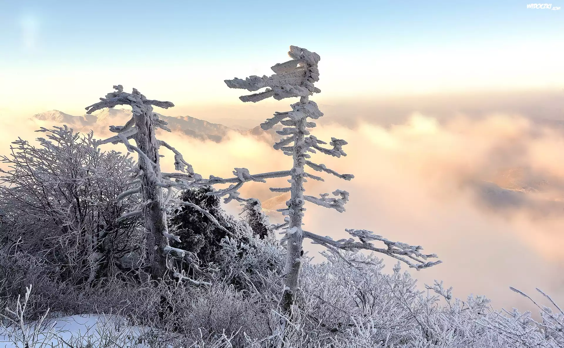 Zdjęcia, Zima, Oszronione, Drzewa, Trawy, Chmury
