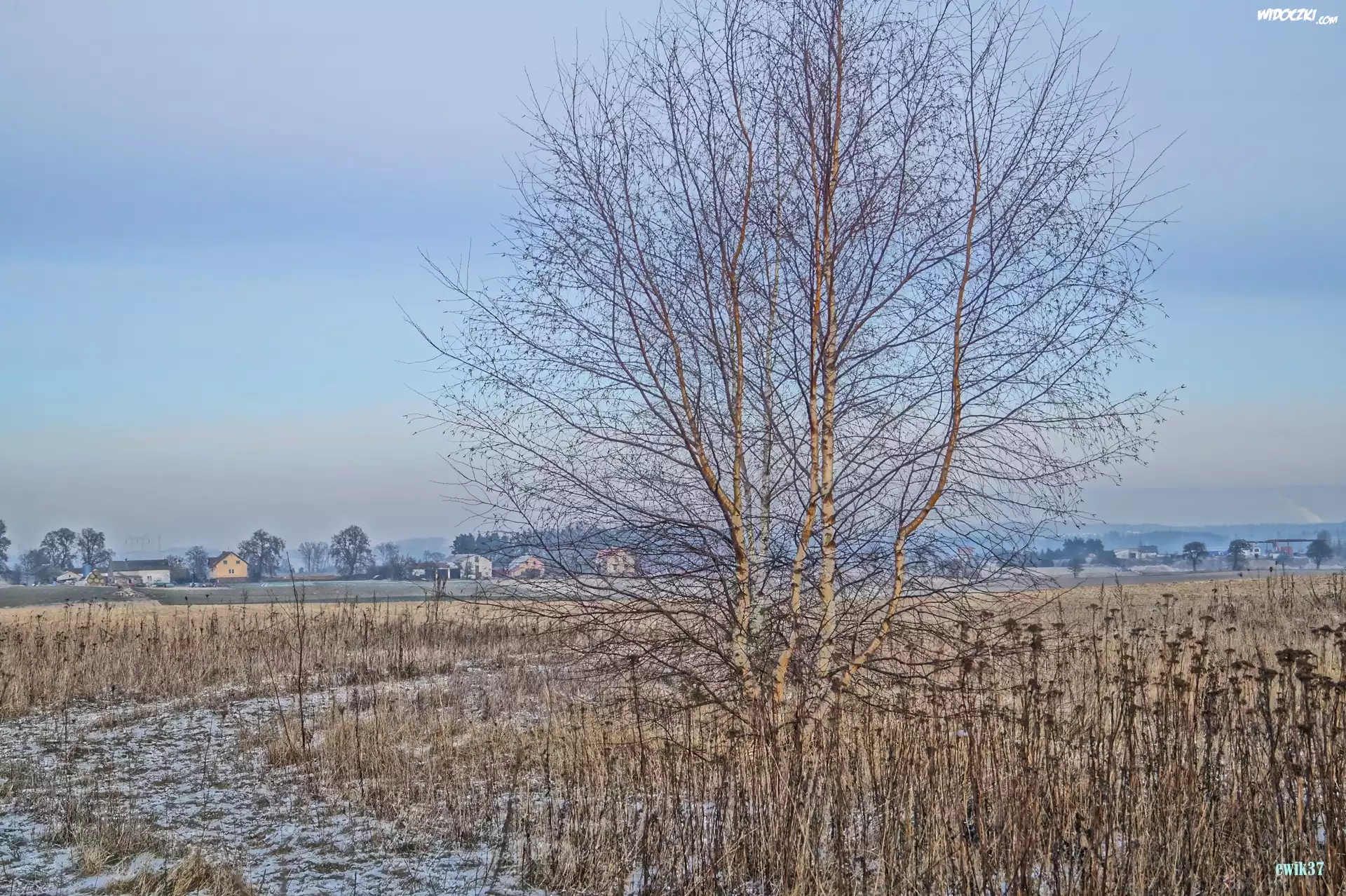Zdjęcia, Zima,Drzewo, Trawy, Niebo