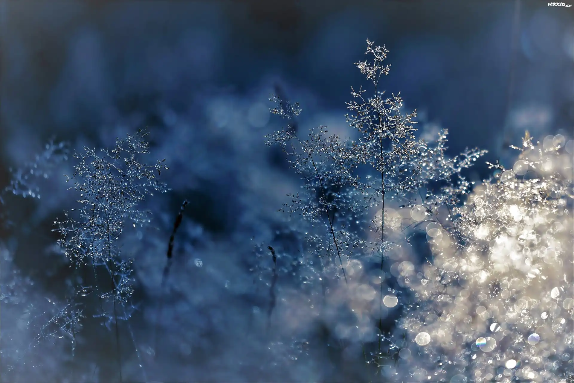 Zdjęcia, Zima, Zamarznięte, Trawy, Światło, Bokeh