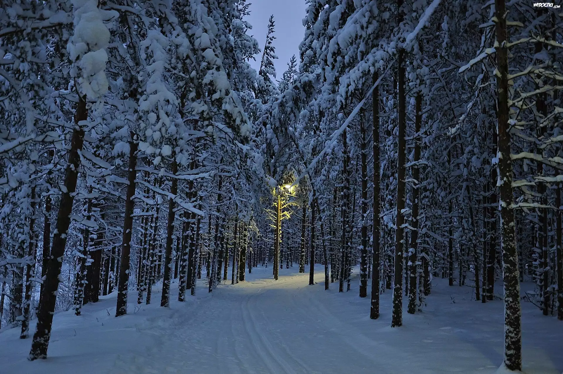 Zdjęcia, Zima, Droga, Las, Zmrok, Świecąca, Lampa