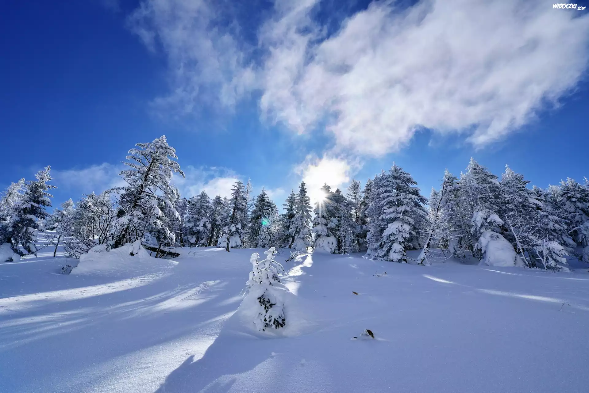 Zdjęcia, Zima, Las, Świerki, Chmury