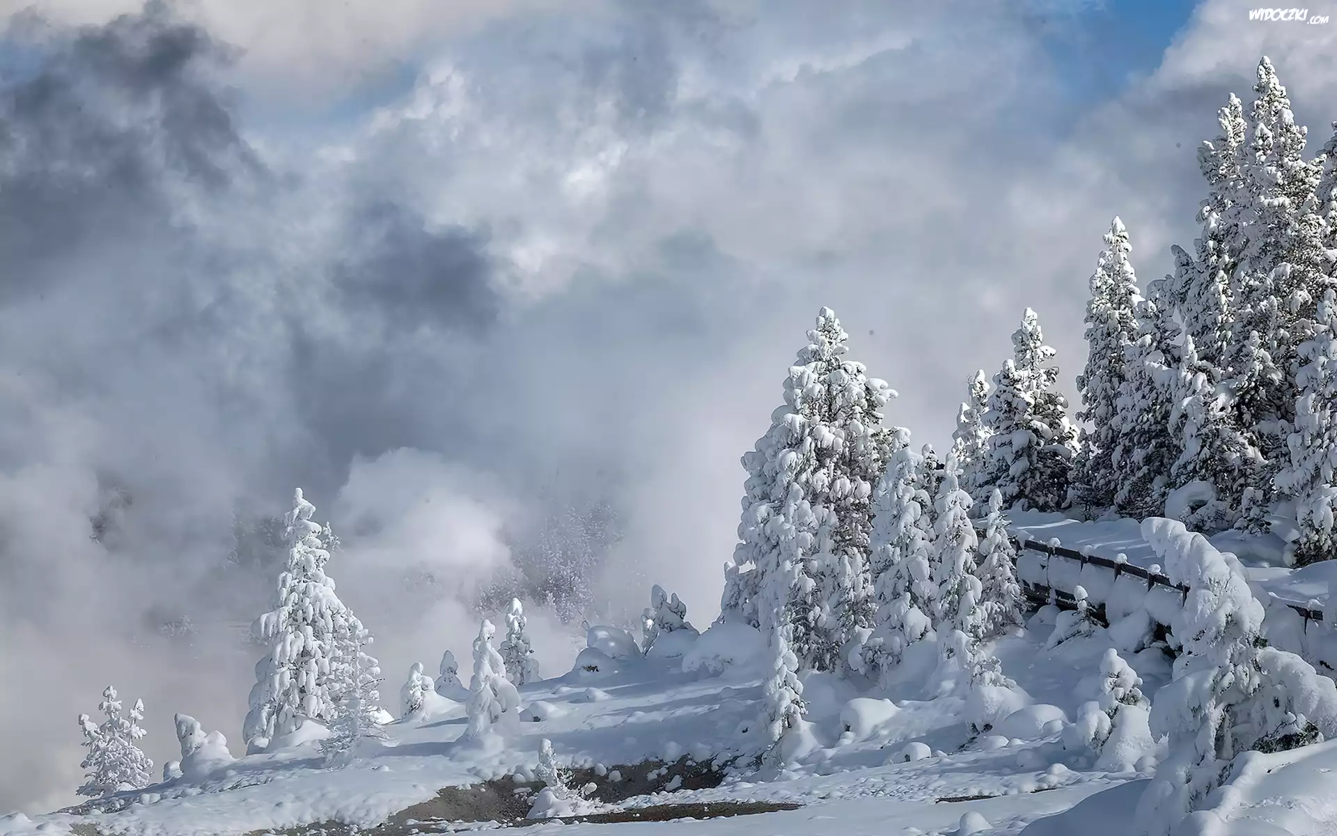 Zdjęcia, Zima, Śnieg, Las, Świerki, Chmury