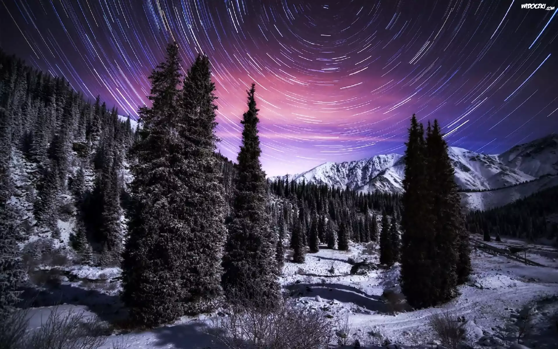 Zdjęcia, Zima, Śnieg, Las, Świerki, Noc