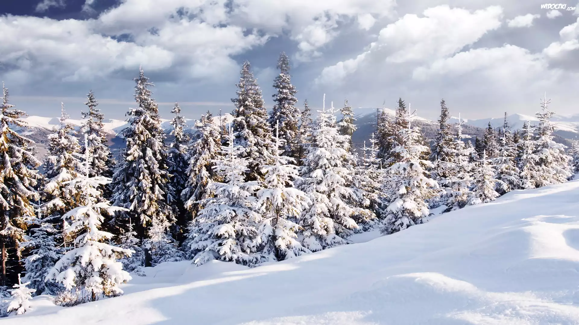 Zdjęcia, Zima, Góry, Las, Ośnieżone, Świerki, Chmury