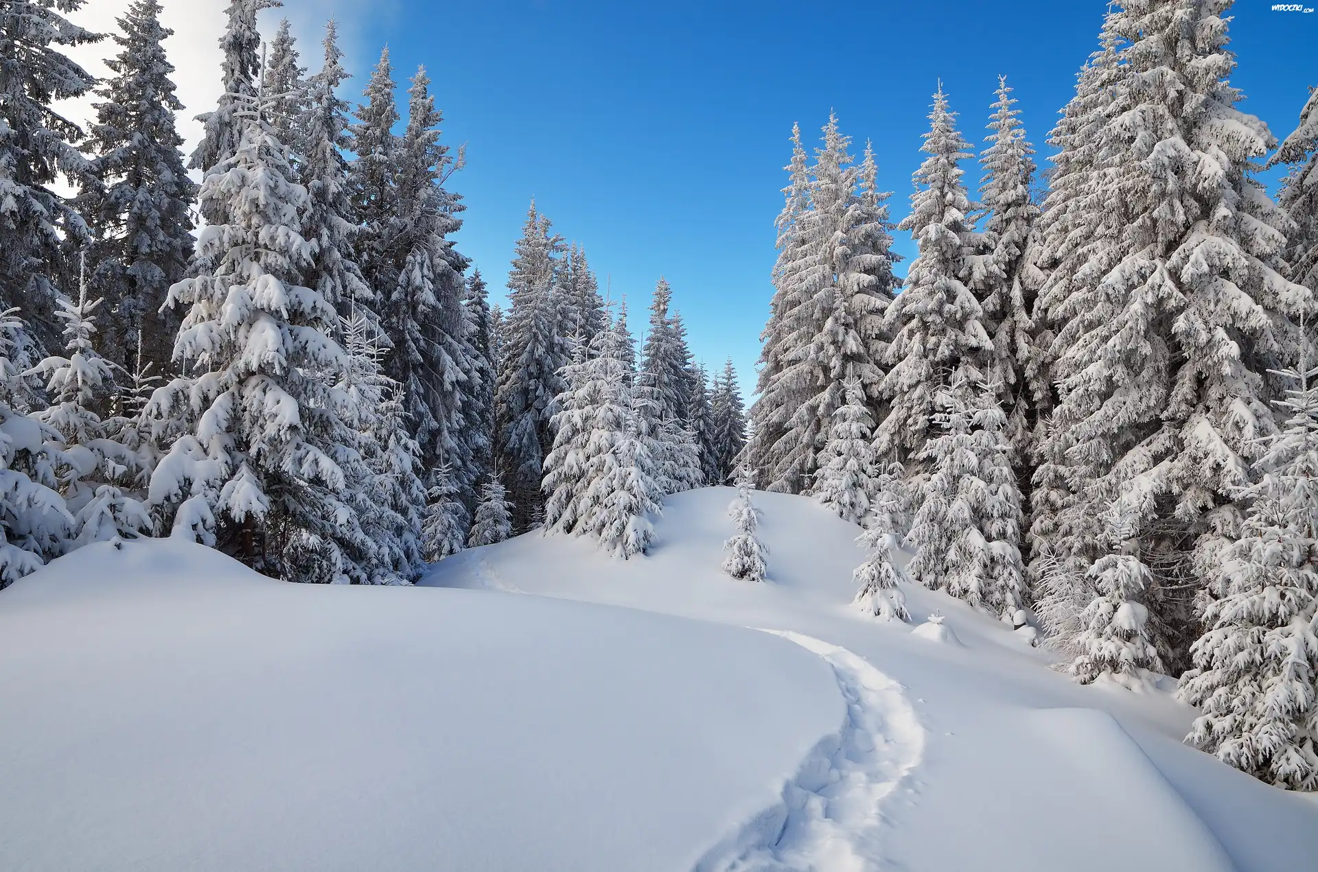 Zdjęcia, Zima, Śnieg, Świerki, Ścieżka