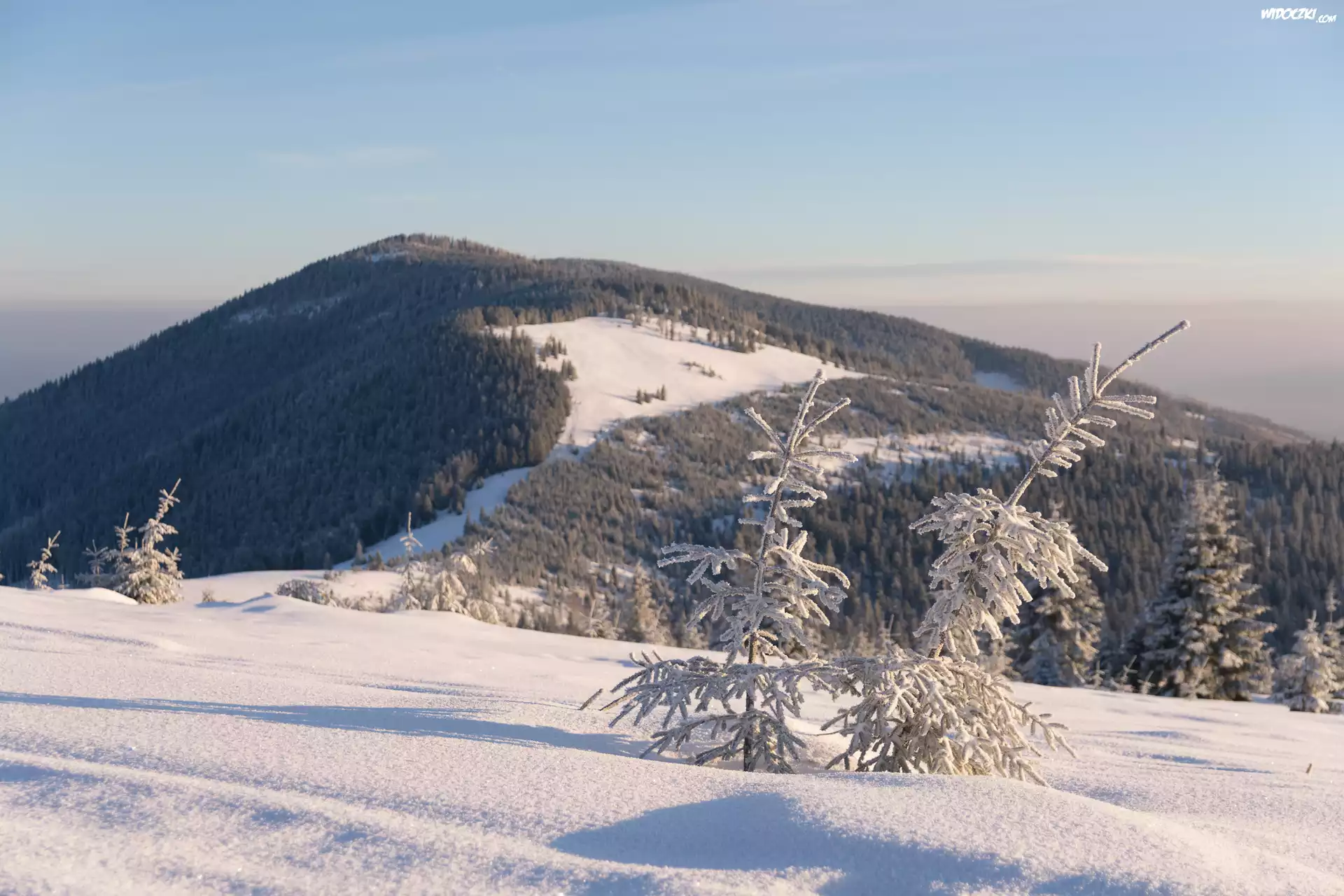 Zdjęcia, Zima, Drzewa, Ośnieżone, Małe, Świerki, Góry