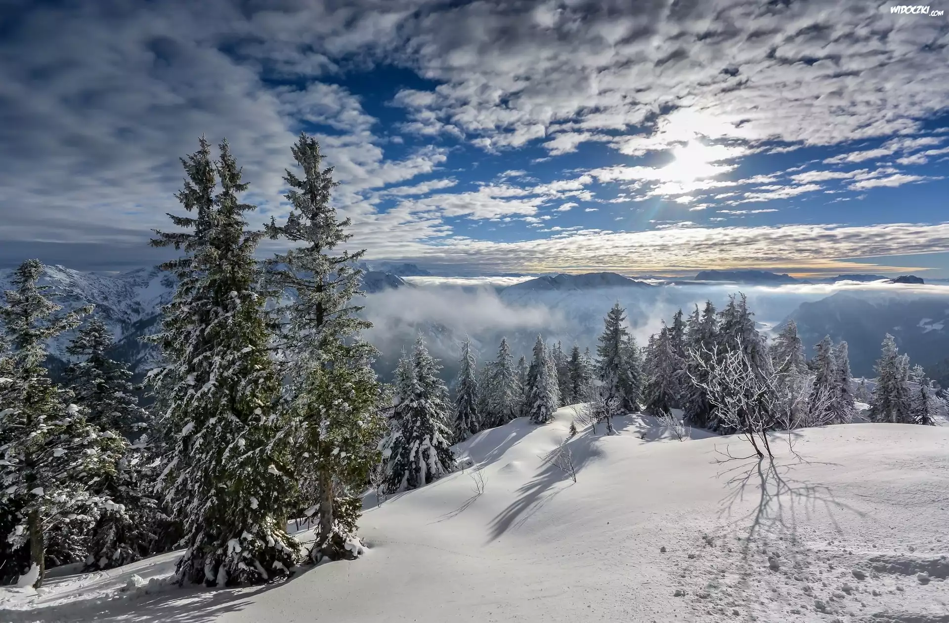 Zdjęcia, Zima, Ośnieżone, Świerki, Wzgórza