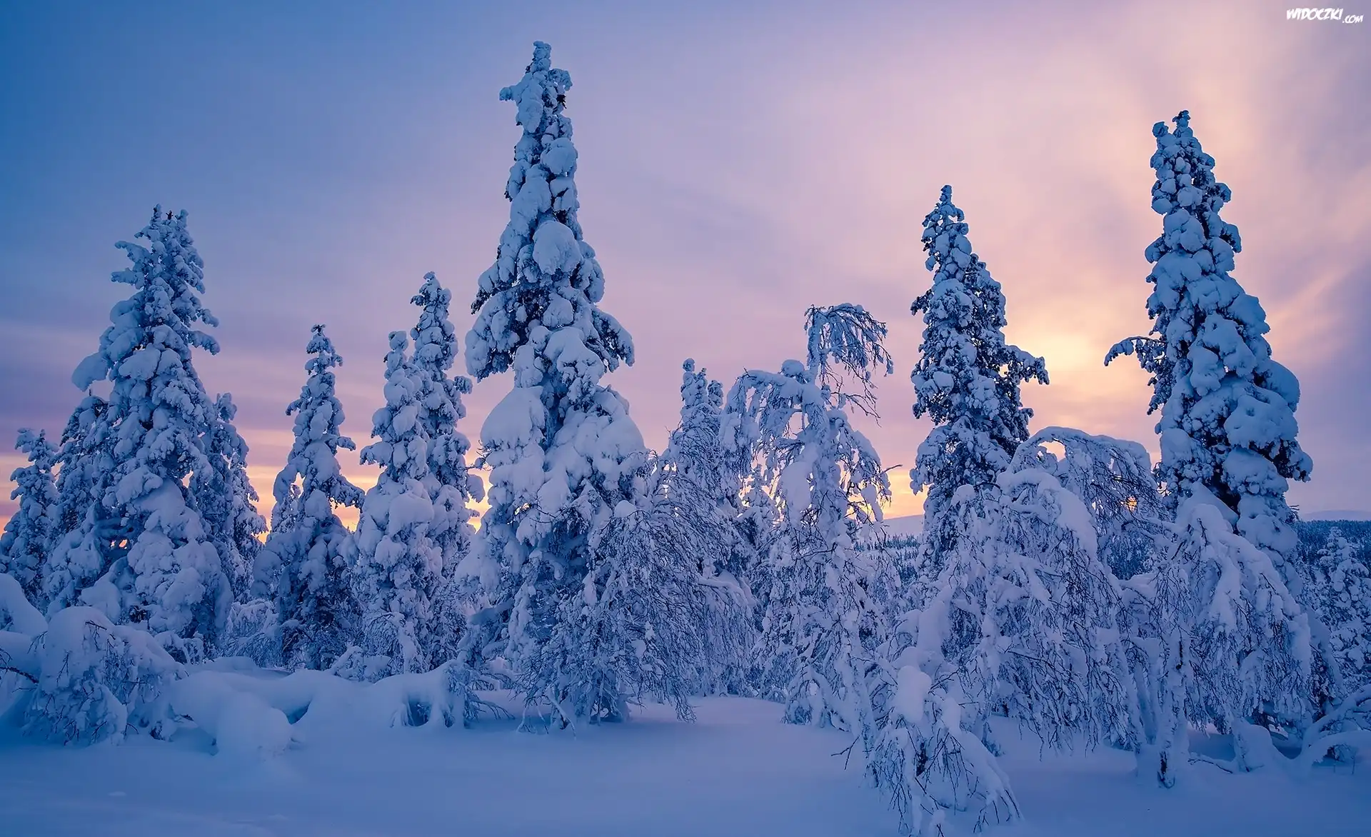 Zdjęcia, Zima, Wschód słońca, Ośnieżone, Świerki, Drzewa