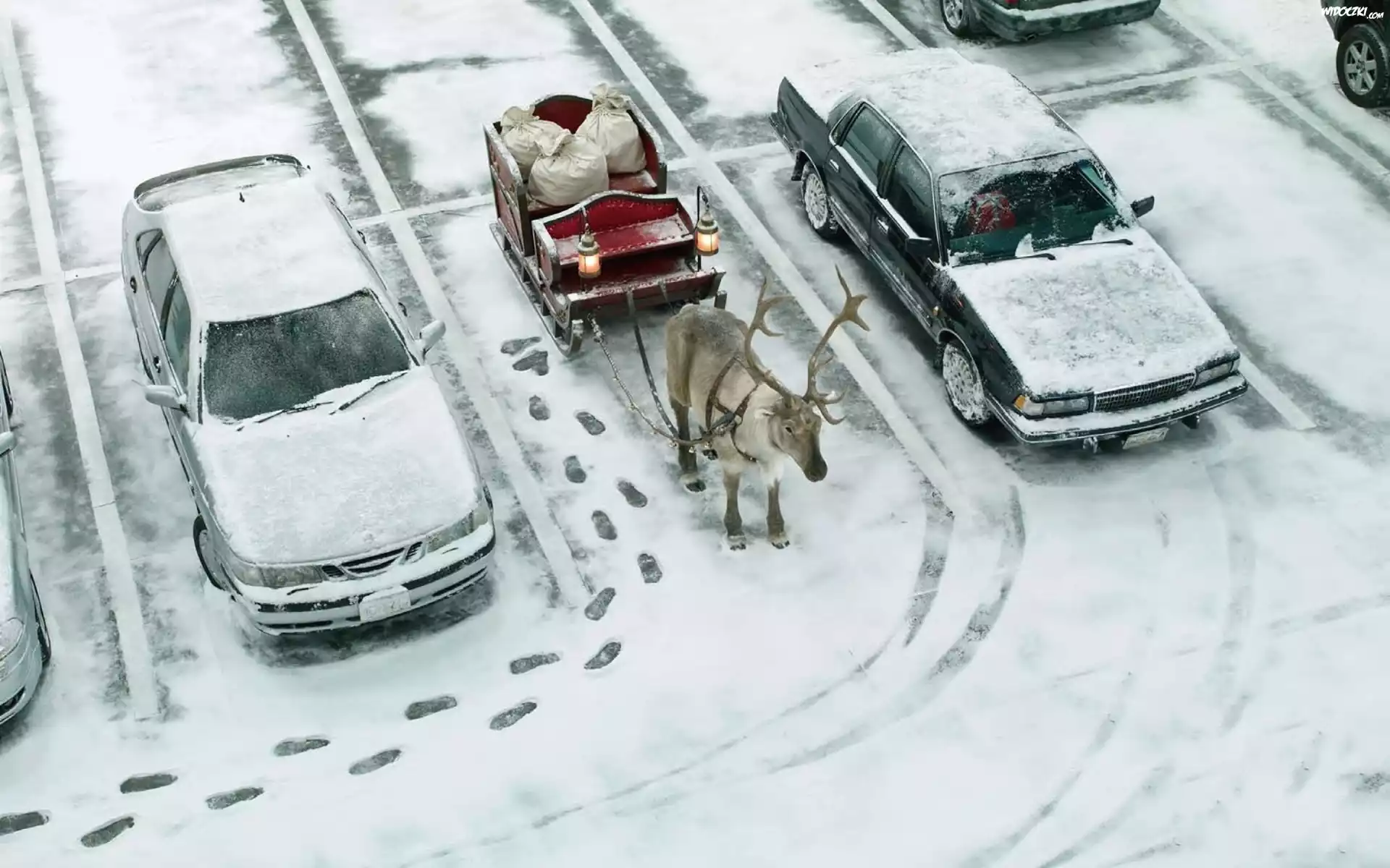 Zdjęcia, Zima, Śnieg, Ślady, Renifer, Święty, Mikołaj