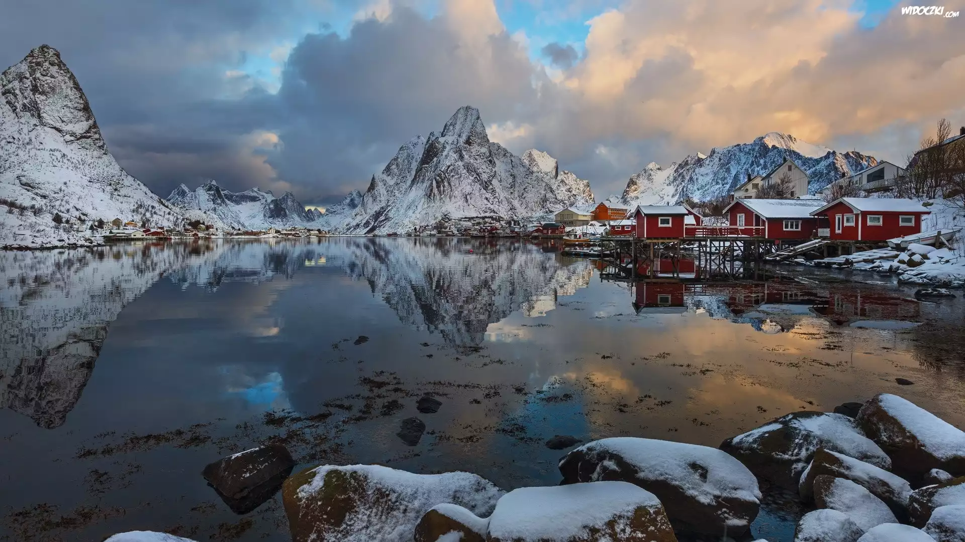 Zdjęcia, Norwegia, Lofoty, Wioska Reine, Czerwone, Domki, Góry, Chmury, Zima