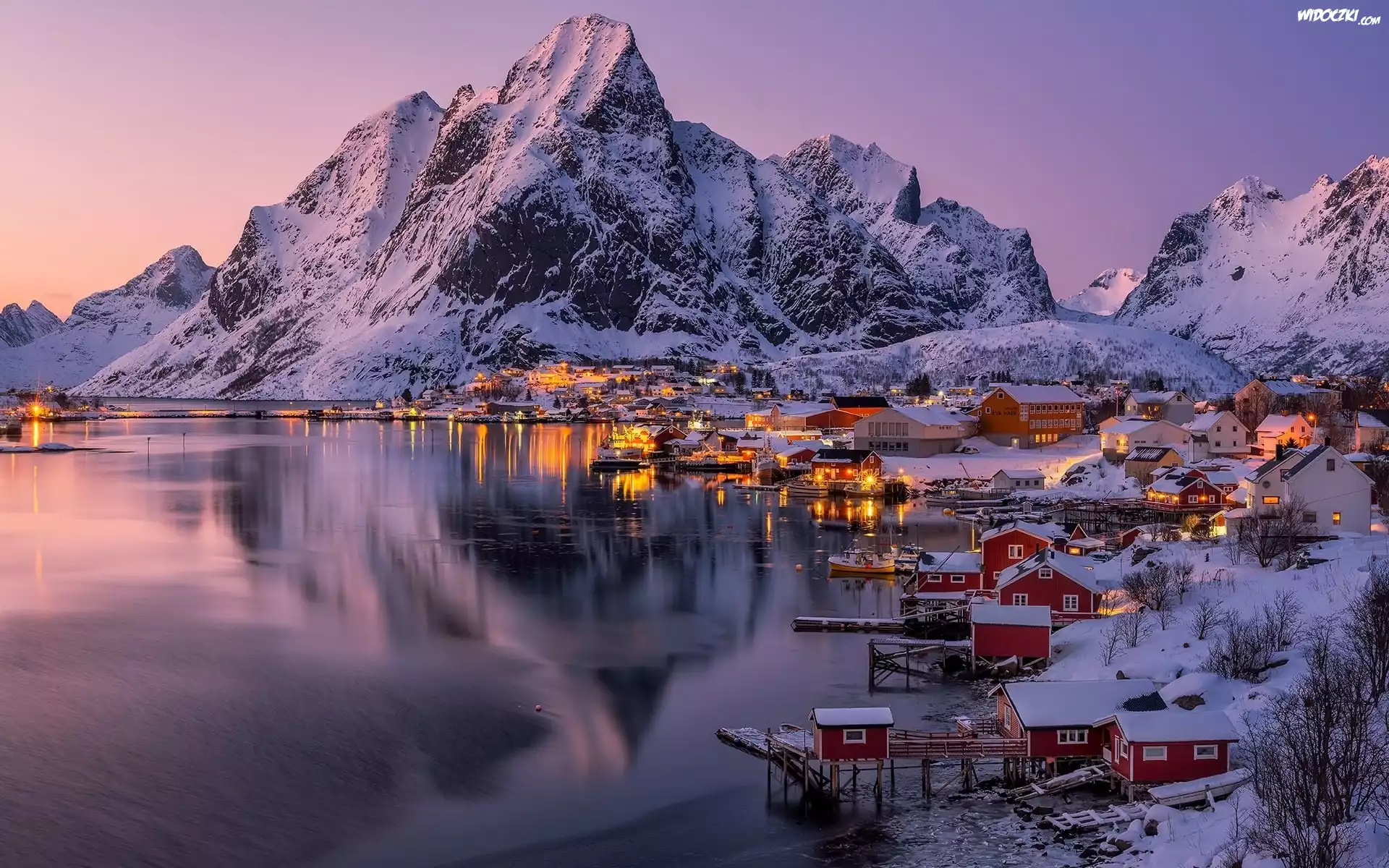 Zdjęcia, Norwegia, Lofoty, Wyspa Moskenesoya, Wioska Reine, Domy, Światła, Góry, Zima