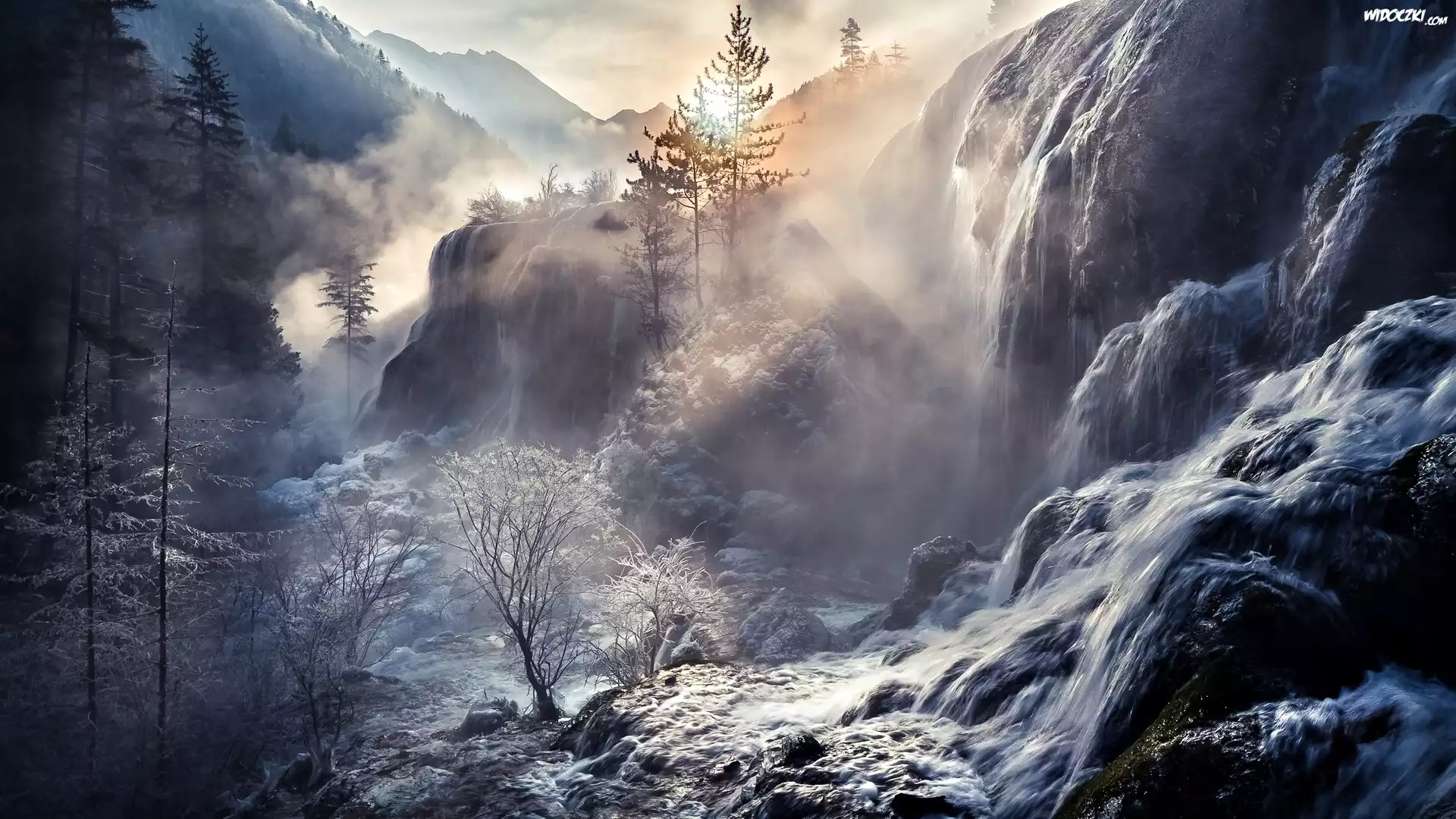 Zdjęcia, Zima, Wschód słońca, Góry, Wodospad, Mgła