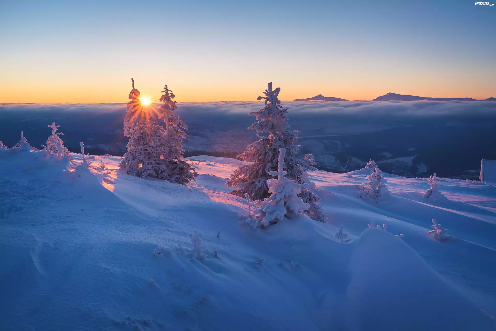 Zdjęcia, Zima, Góry, Chmury, Wschód słońca