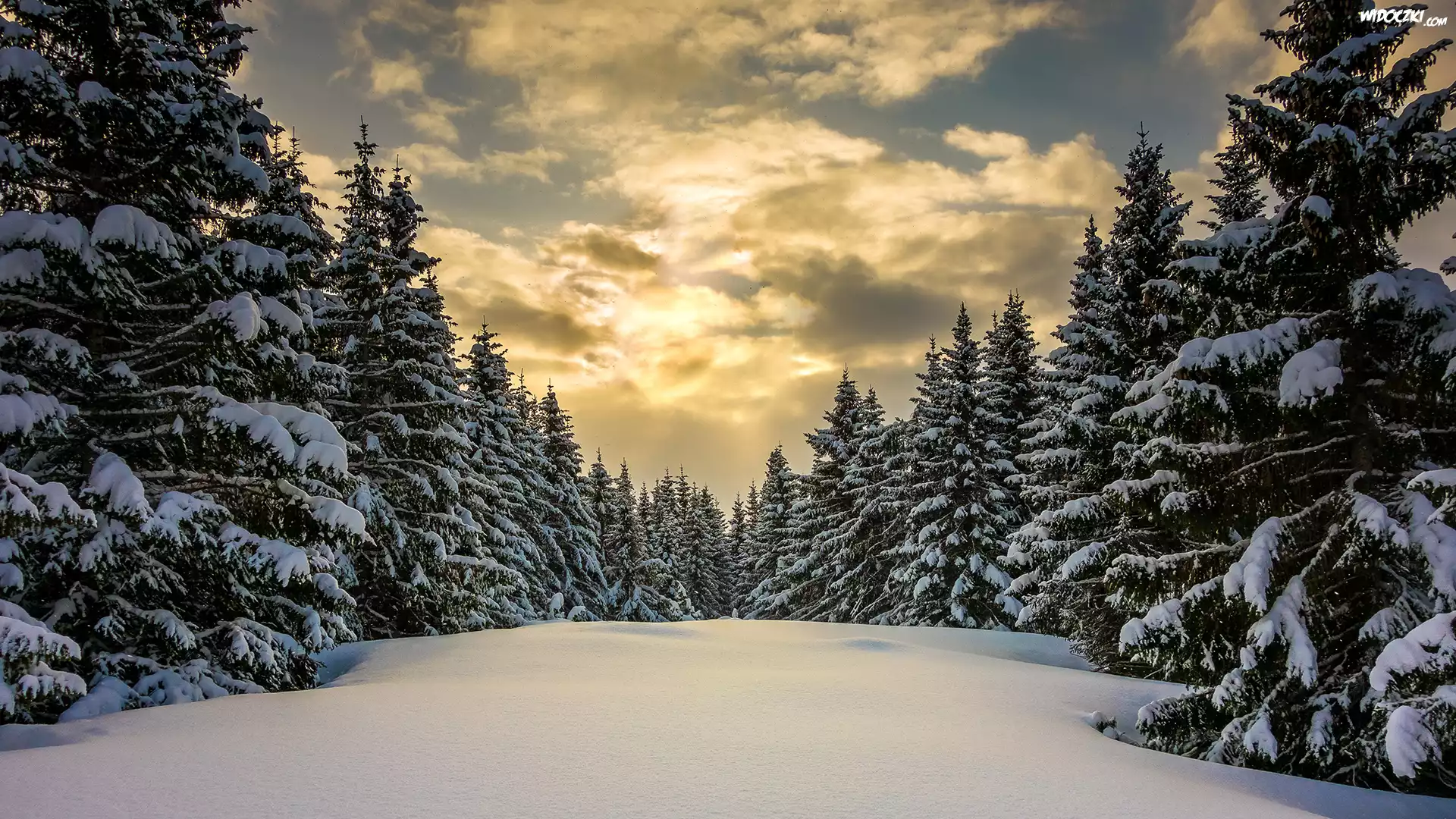 Zdjęcia, Zima, Las, Chmury, Wschód słońca