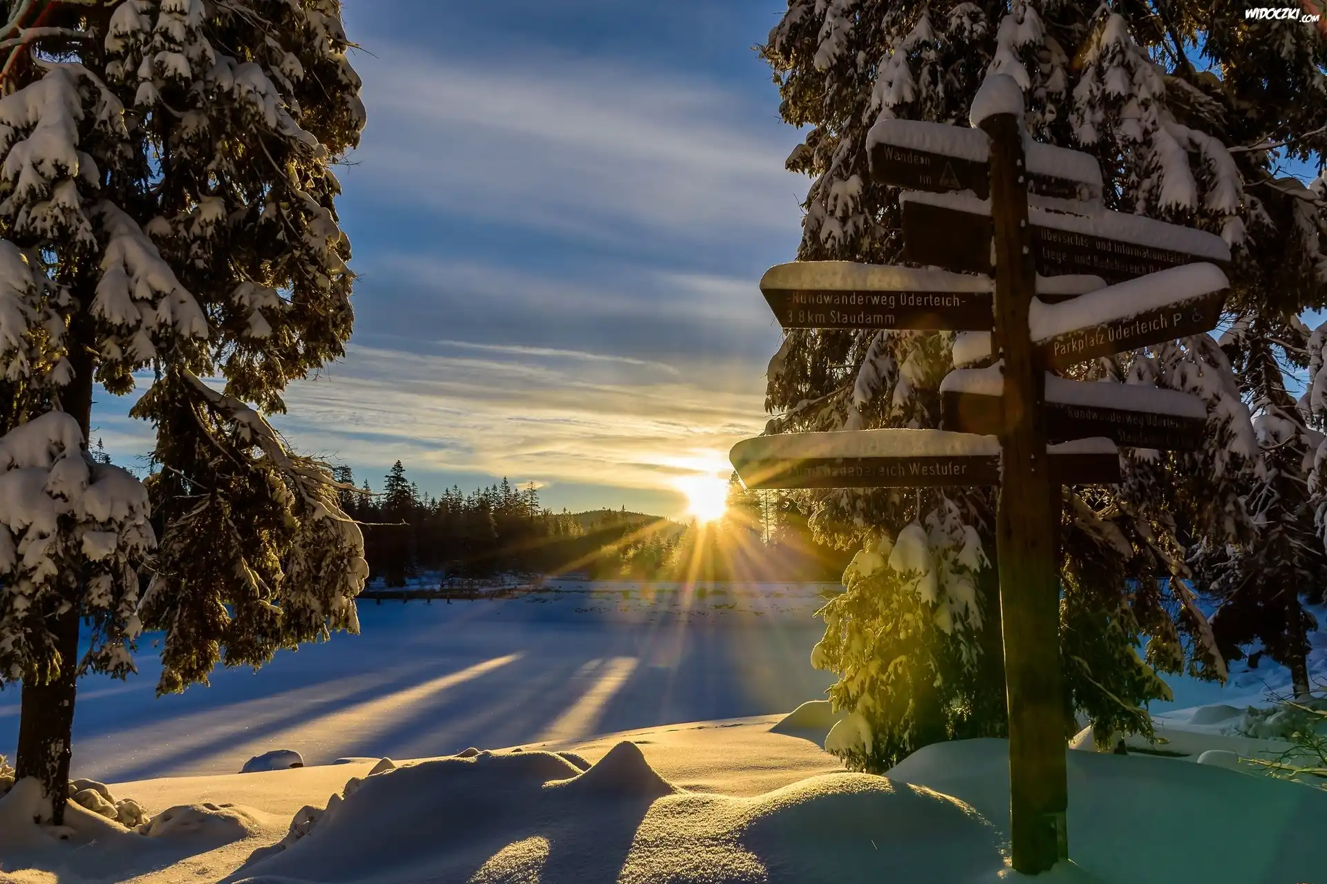 Zdjęcia, Zima, Drogowskaz, Drzewa, Wschód słońca