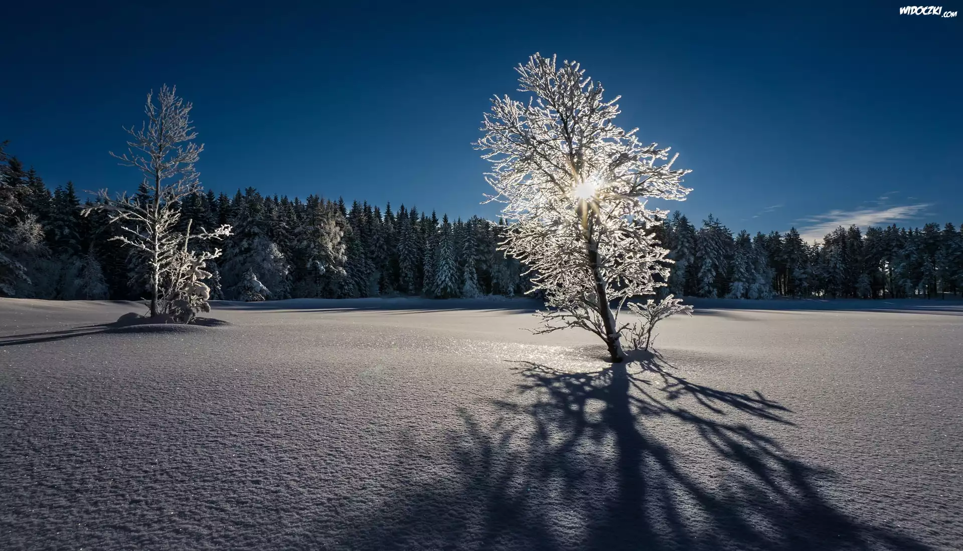 Zima, Śnieg, Drzewa, Wschód słońca