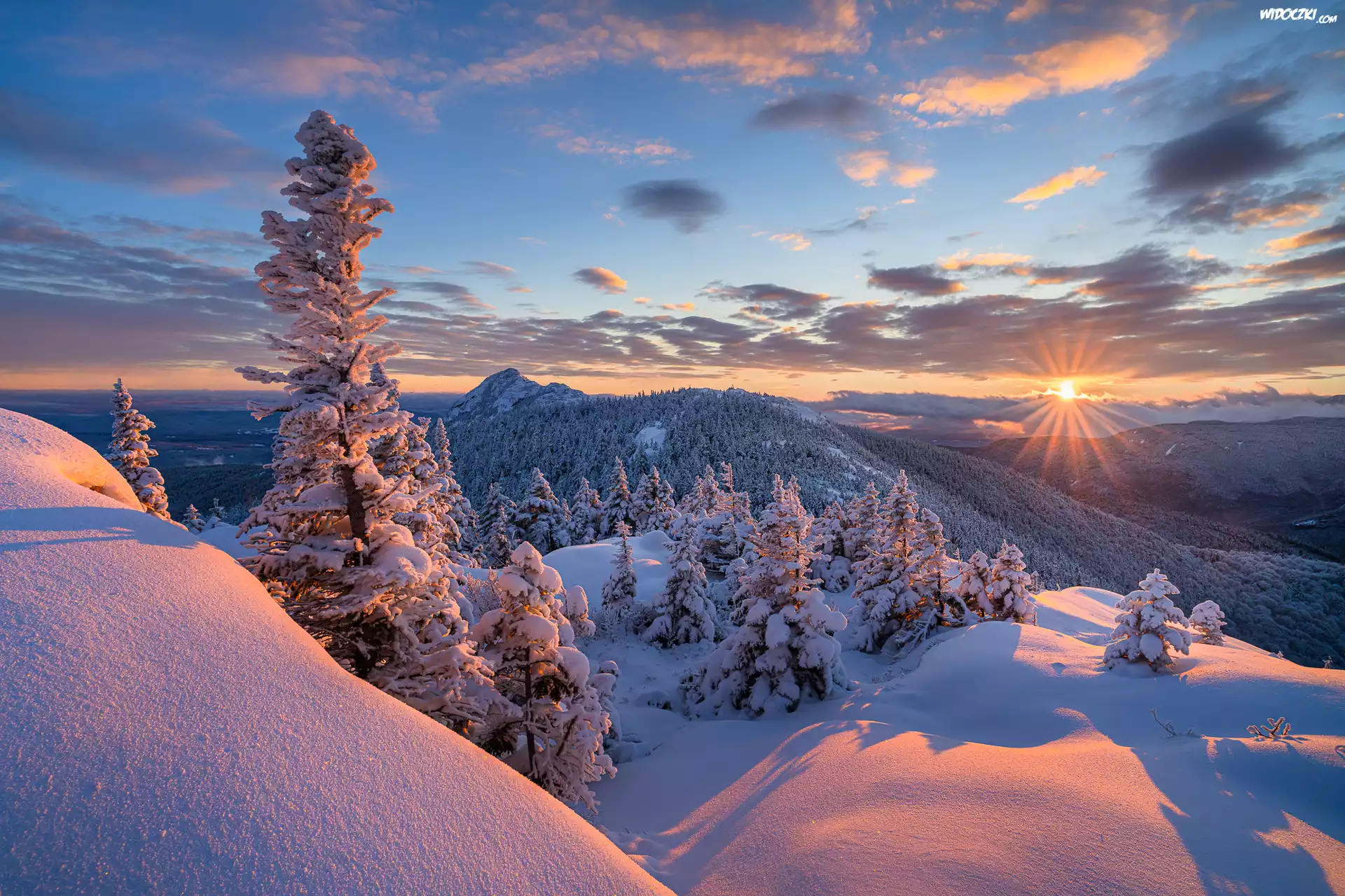 Zima, Śnieg, Góry, Las, Ośnieżone, Drzewa, Wschód słońca, Chmury