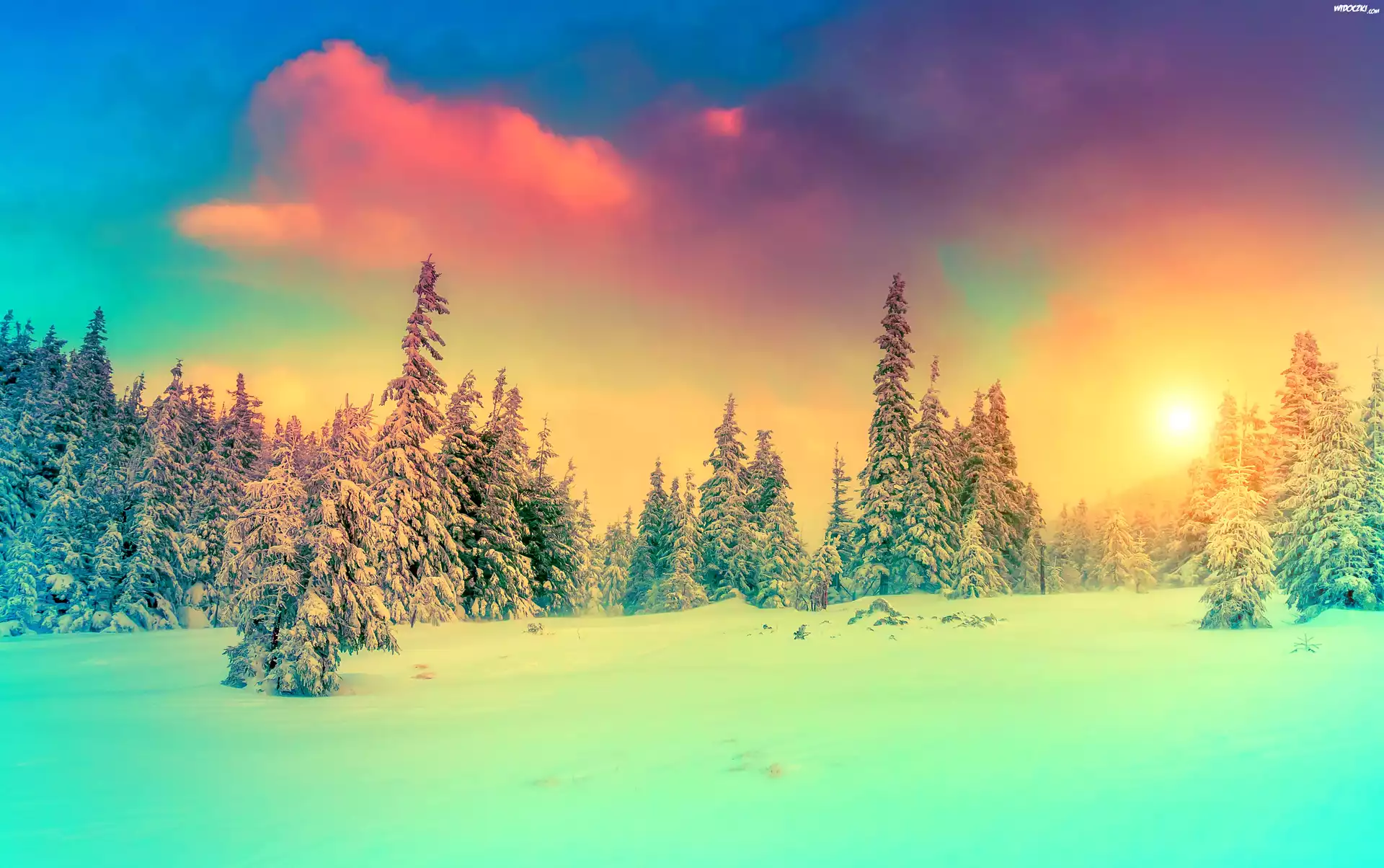 Zima, Śnieg, Las, Chmury, Wschód słońca