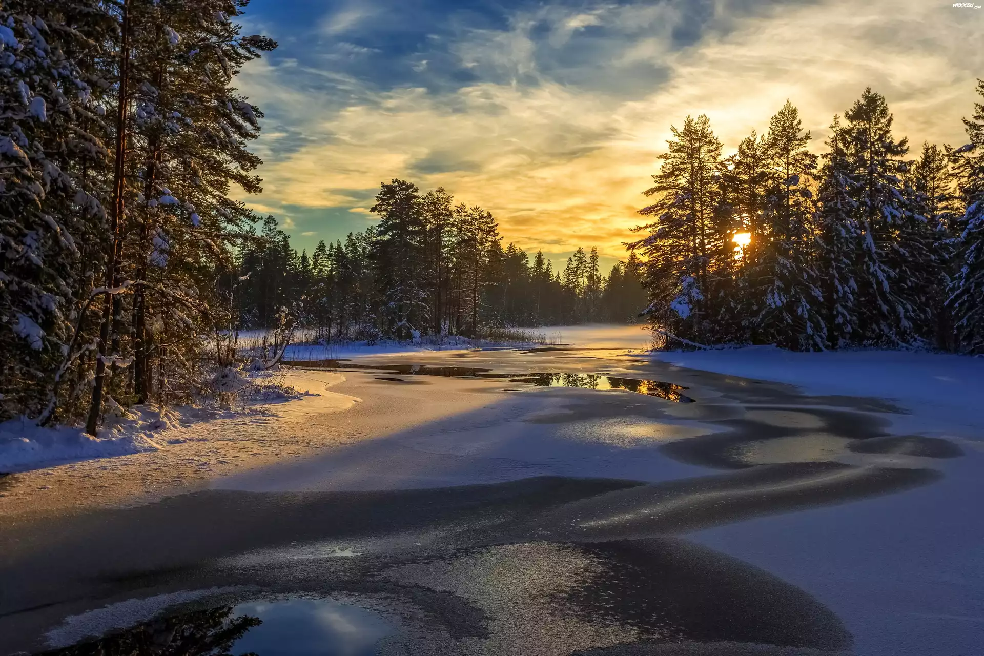 Zdjęcia, Zima, Rzeka, Las, Wschód słońca