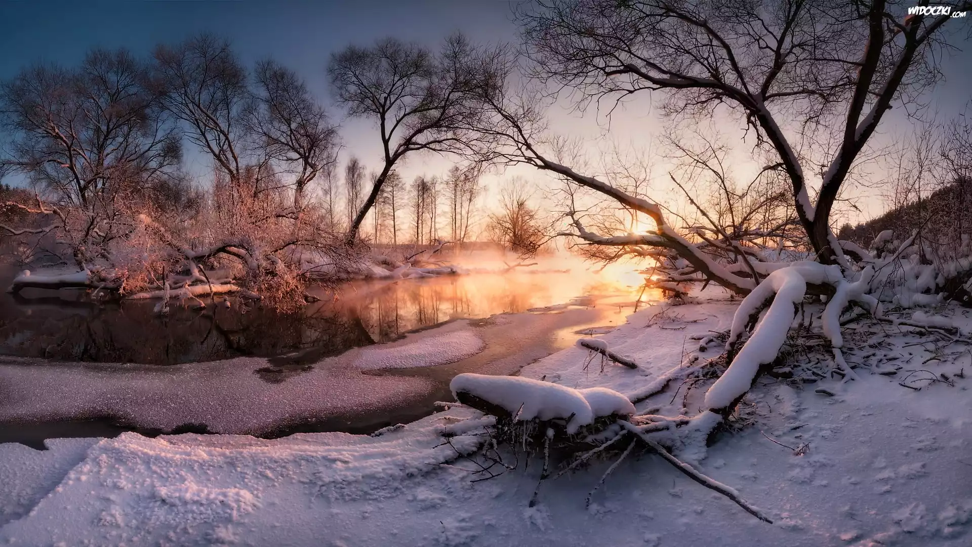 Zima, Staw, Mgła, Drzewa, Wschód, Słońca
