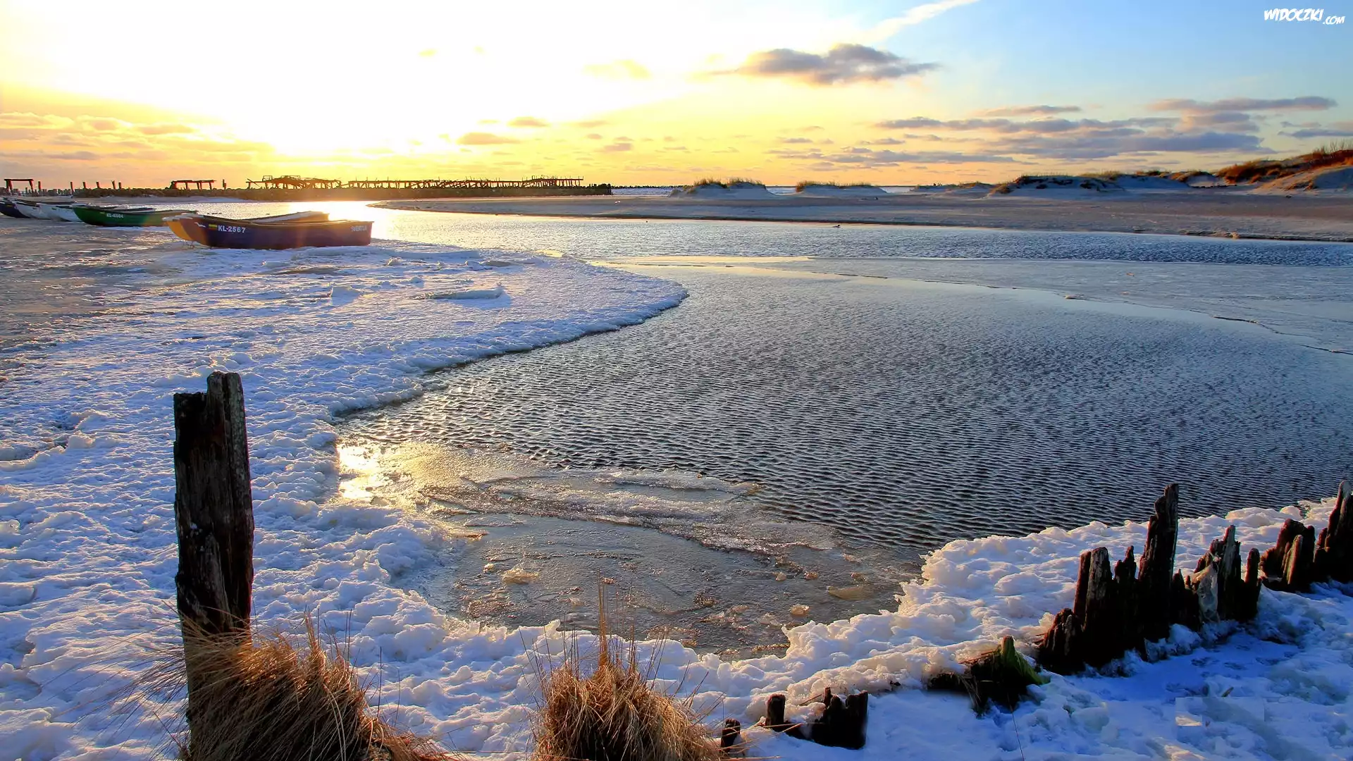 Zima, Rzeka, Łodzie, Wschód, Słońca