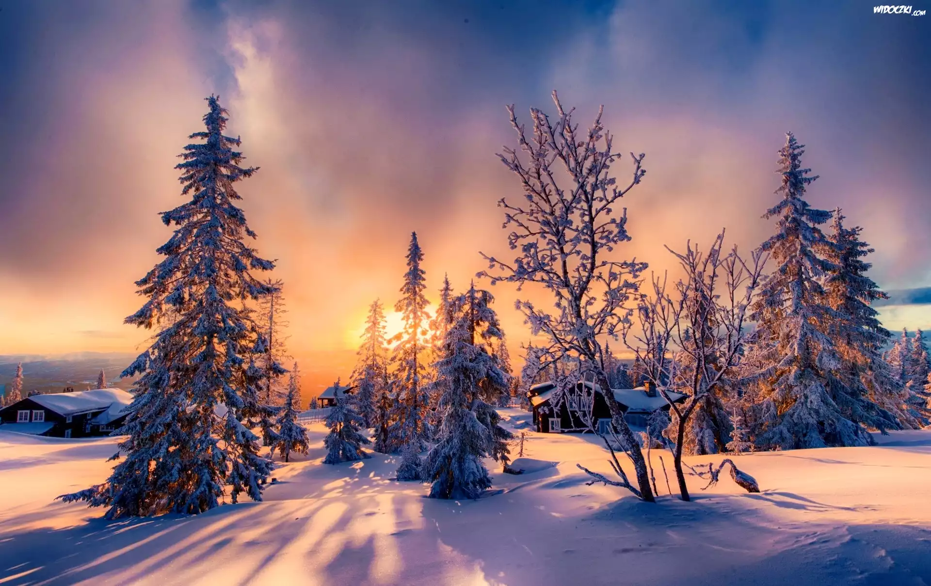 Zima, Domy, Wieś, Wschód słońca