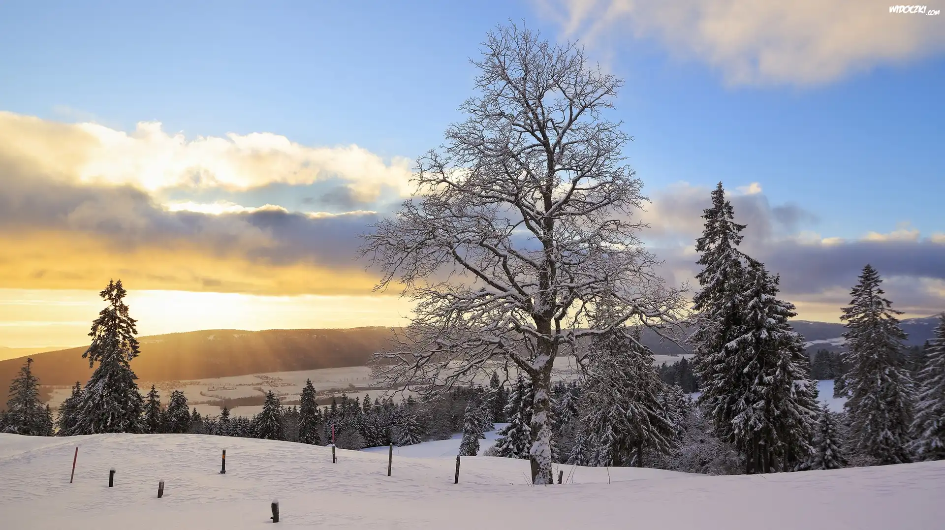 Zdjęcia, Zima, Drzewa, Wzgórza, Niebo, Wschód słońca