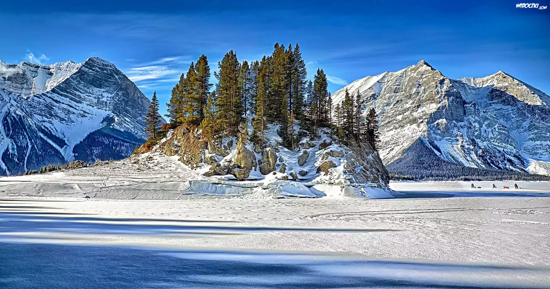 Zdjęcia, Zima, Góry, Zamarznięte, Jezioro, Wyspa, Drzewa