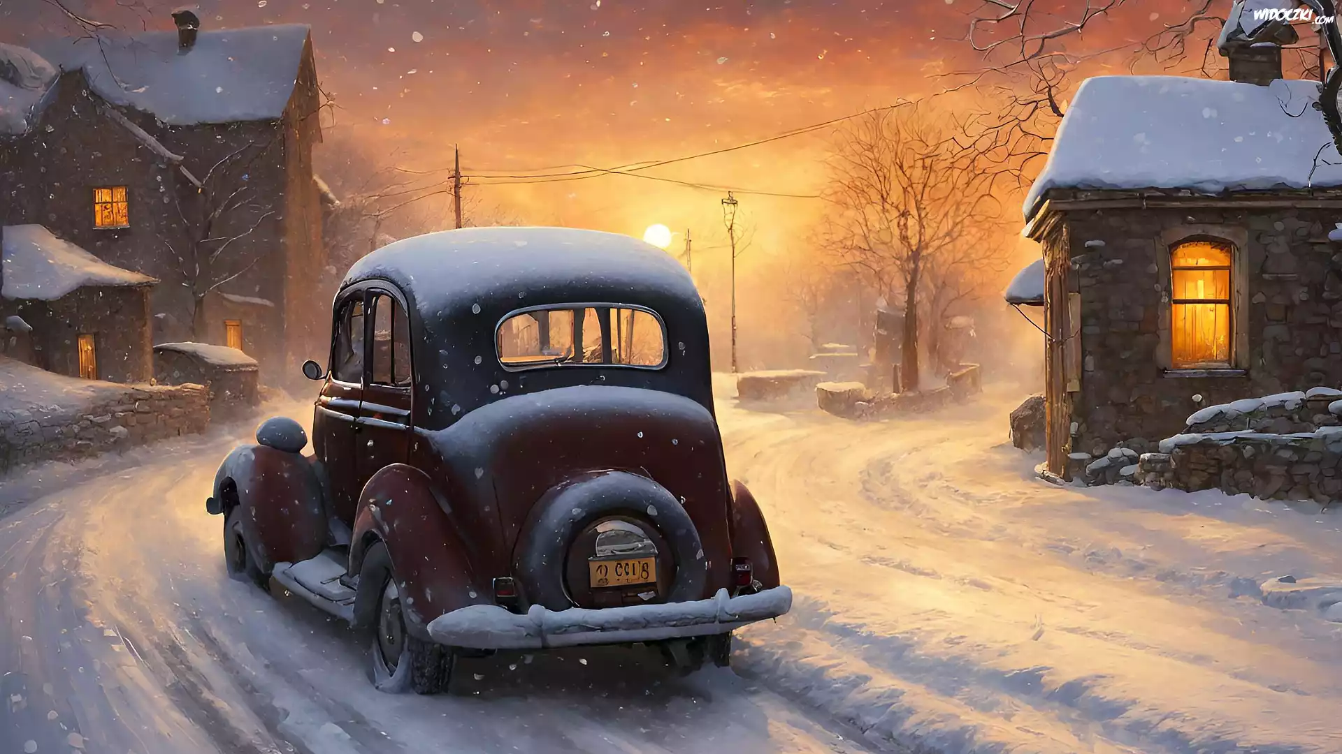 Stary, Samochód, Zabytkowy, Zima, Śnieg, Domy, 2D