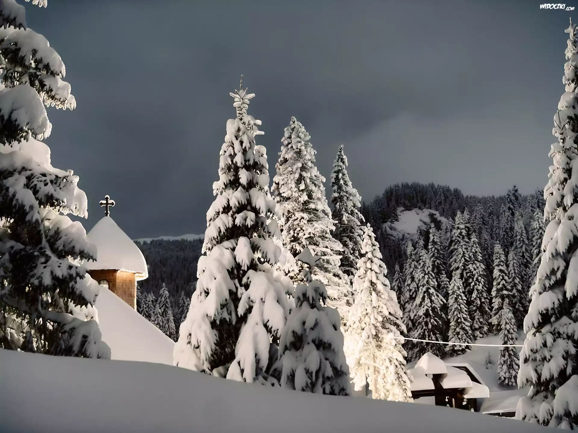 Zdjęcia, Zima, Las, Kościół, Zachmurzone, Niebo
