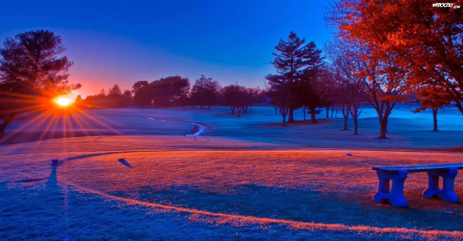 Zdjęcia, Zima, Park, Ławeczka, Drzewa, Zachód Słońca