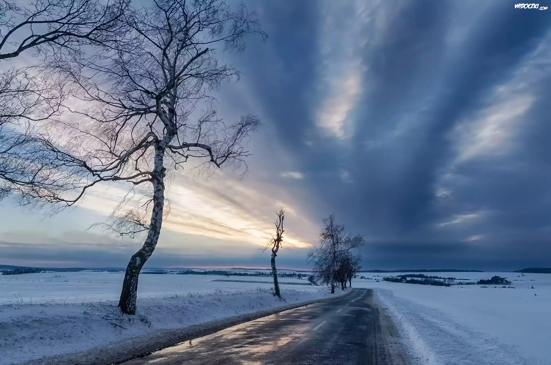 Zdjęcia, Zima, Droga, Drzewa, Chmury, Zachód słońca