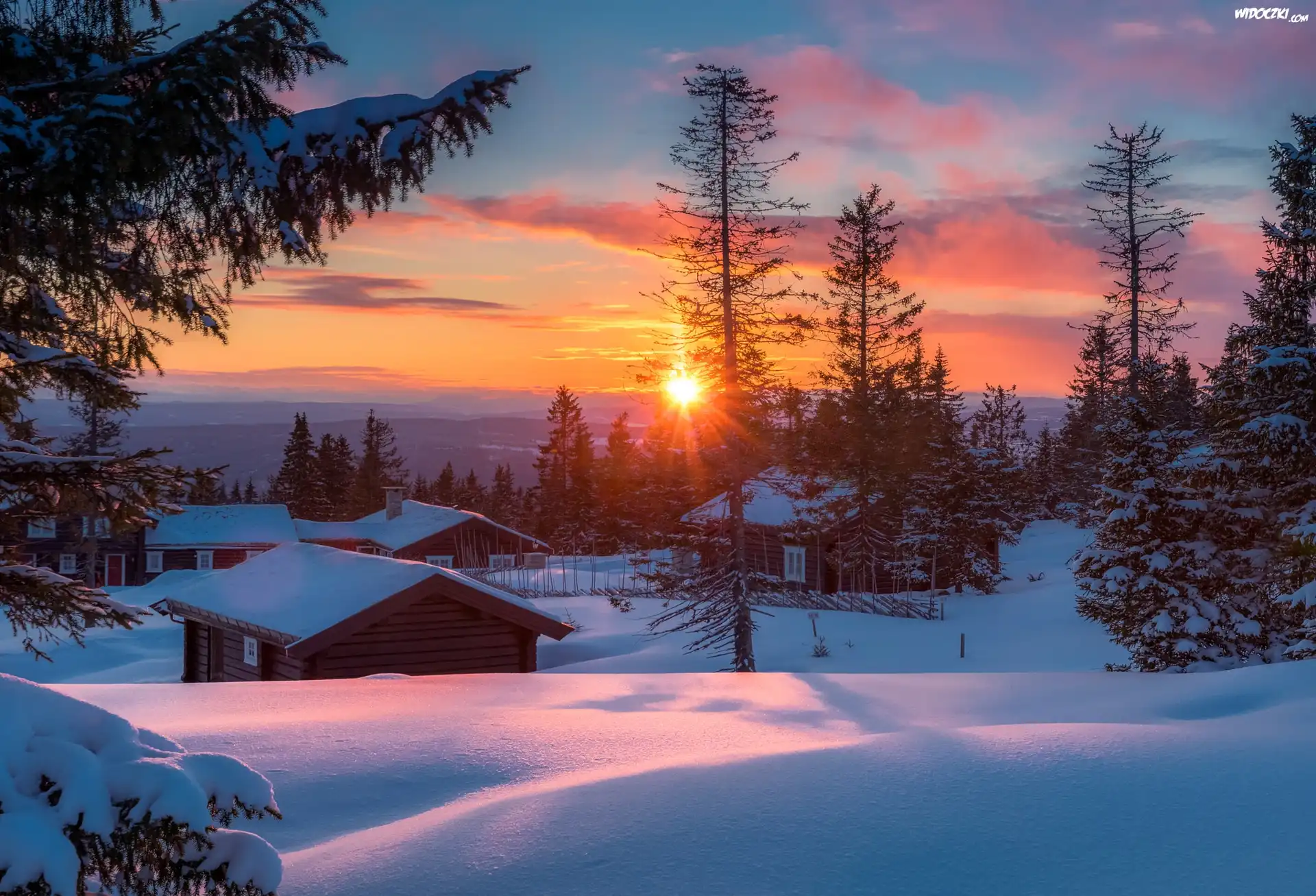 Zdjęcia, Zima, Domy, Drzewa, Zachód słońca