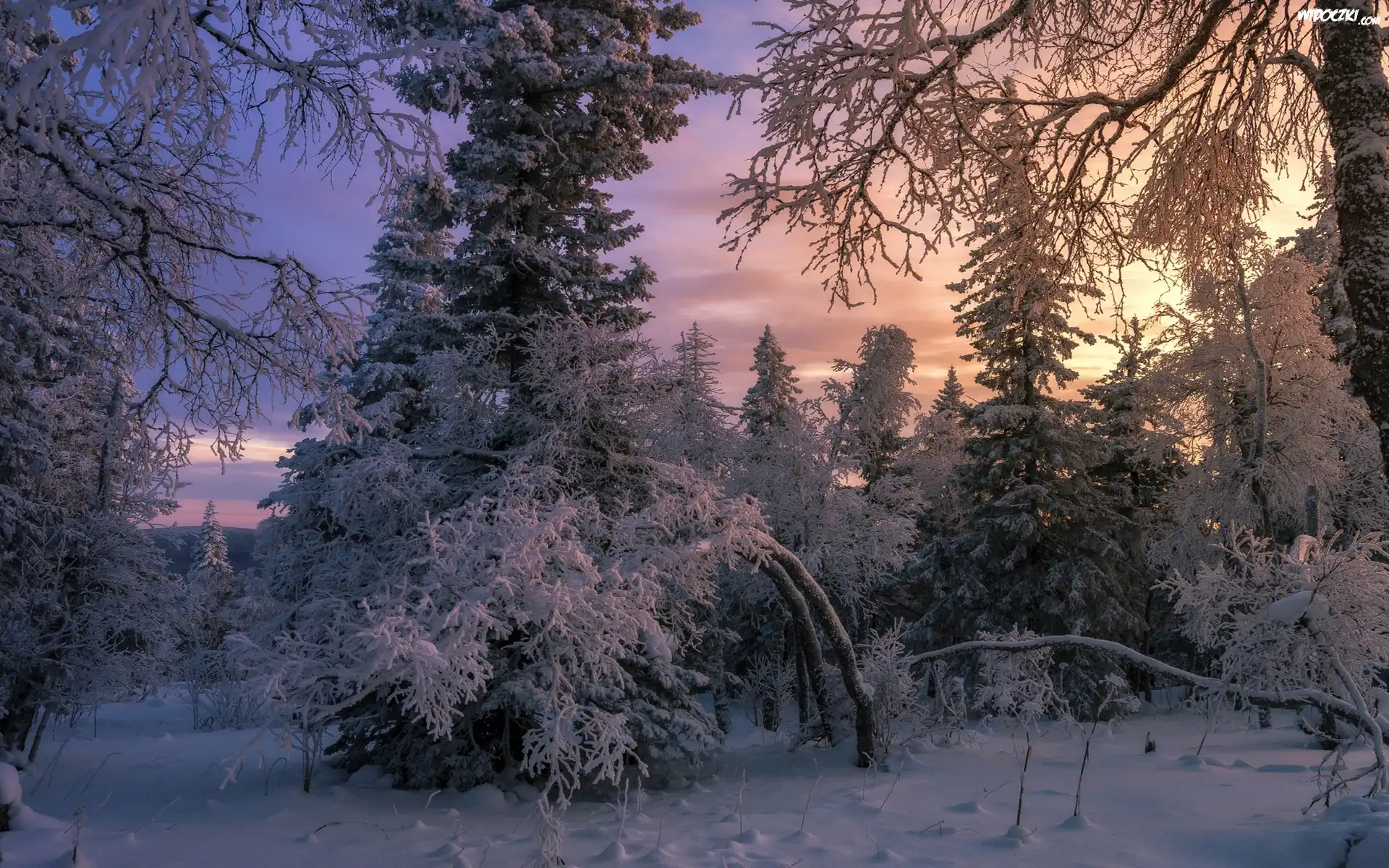 Zdjęcia, Zima, Ośnieżone, Drzewa, Gałęzie, Zachód słońca