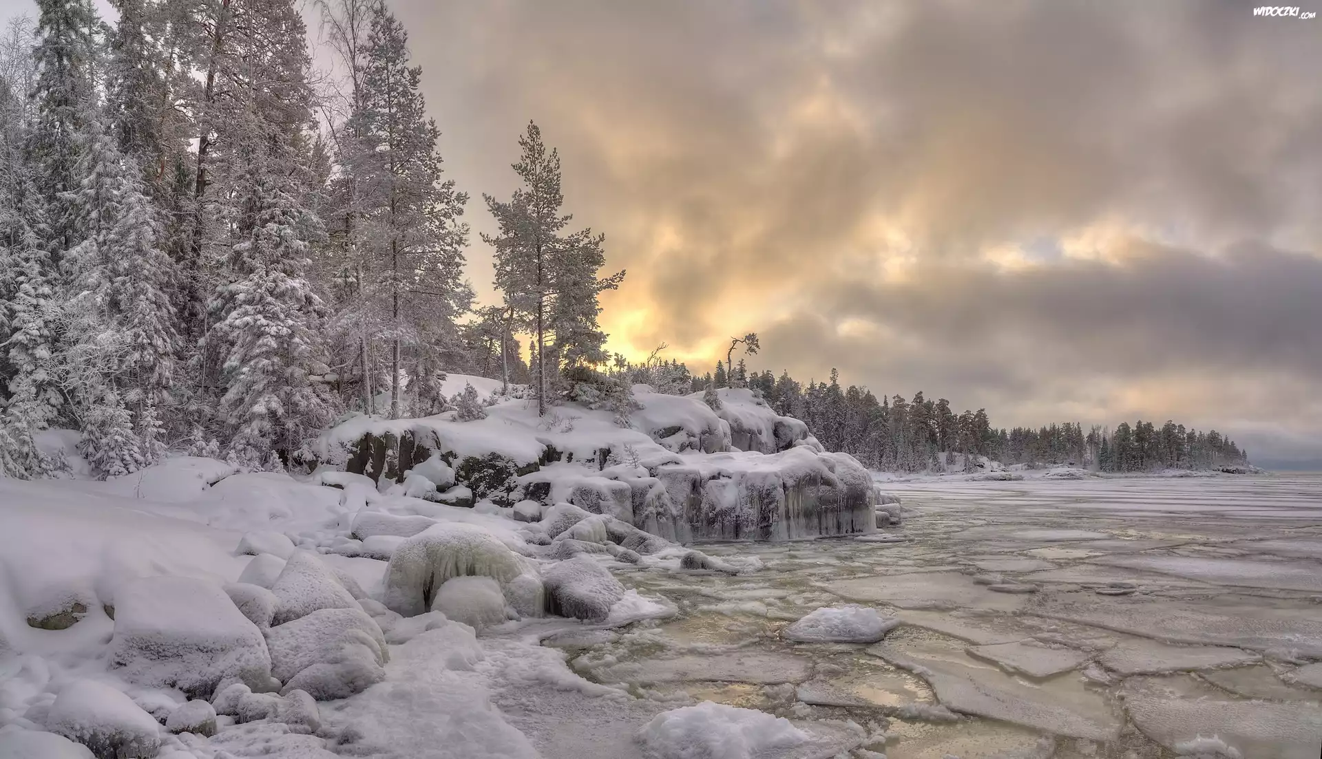 Zdjęcia, Zima, Jezioro, Drzewa, Zachód słońca