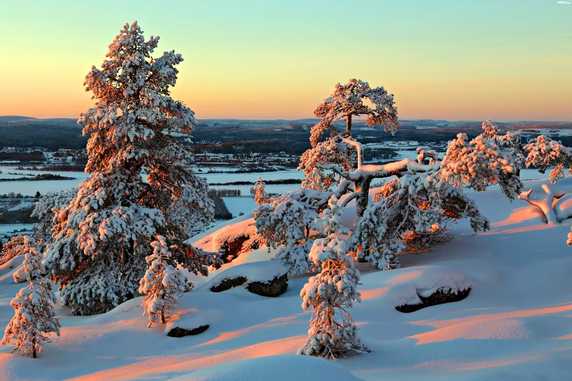 Zima, Ośnieżone Drzewa, Krajobraz, Zachód Słońca