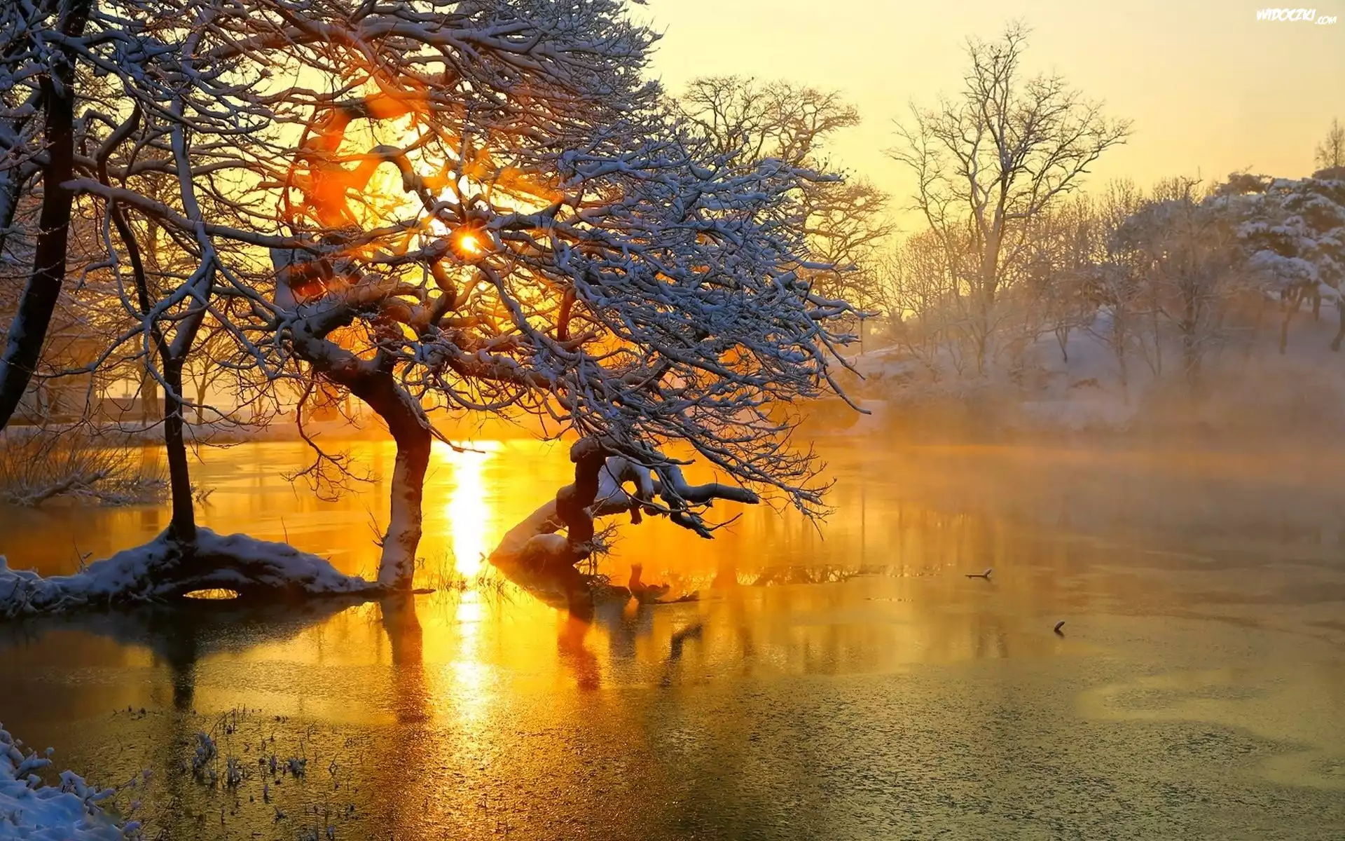 Zdjęcia, Zima, Rzeka, Drzewa, Mgła, Zachód, Słońca