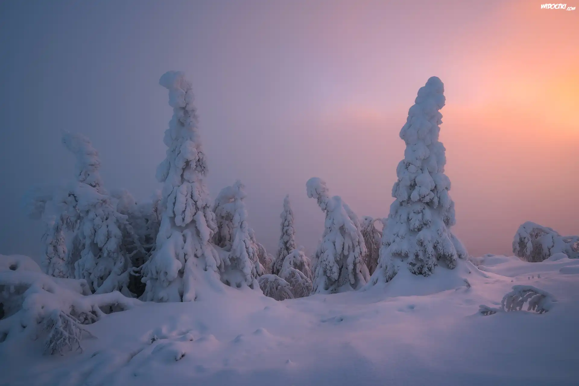 Zdjęcia, Zima, Zaśnieżone, Drzewa, Mgła, Zachód słońca