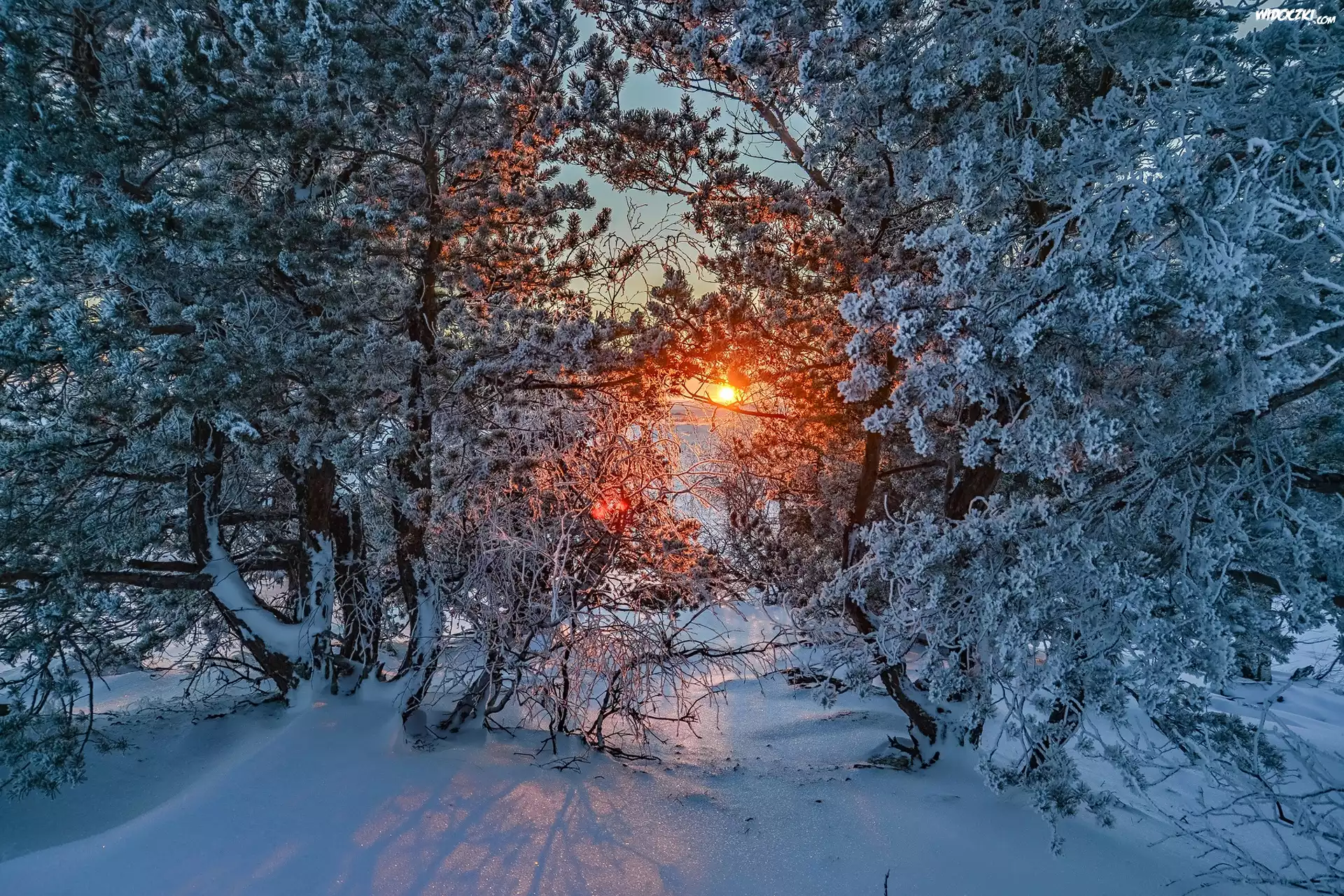Zima, Ośnieżone, Drzewa, Śnieg, Zachód słońca