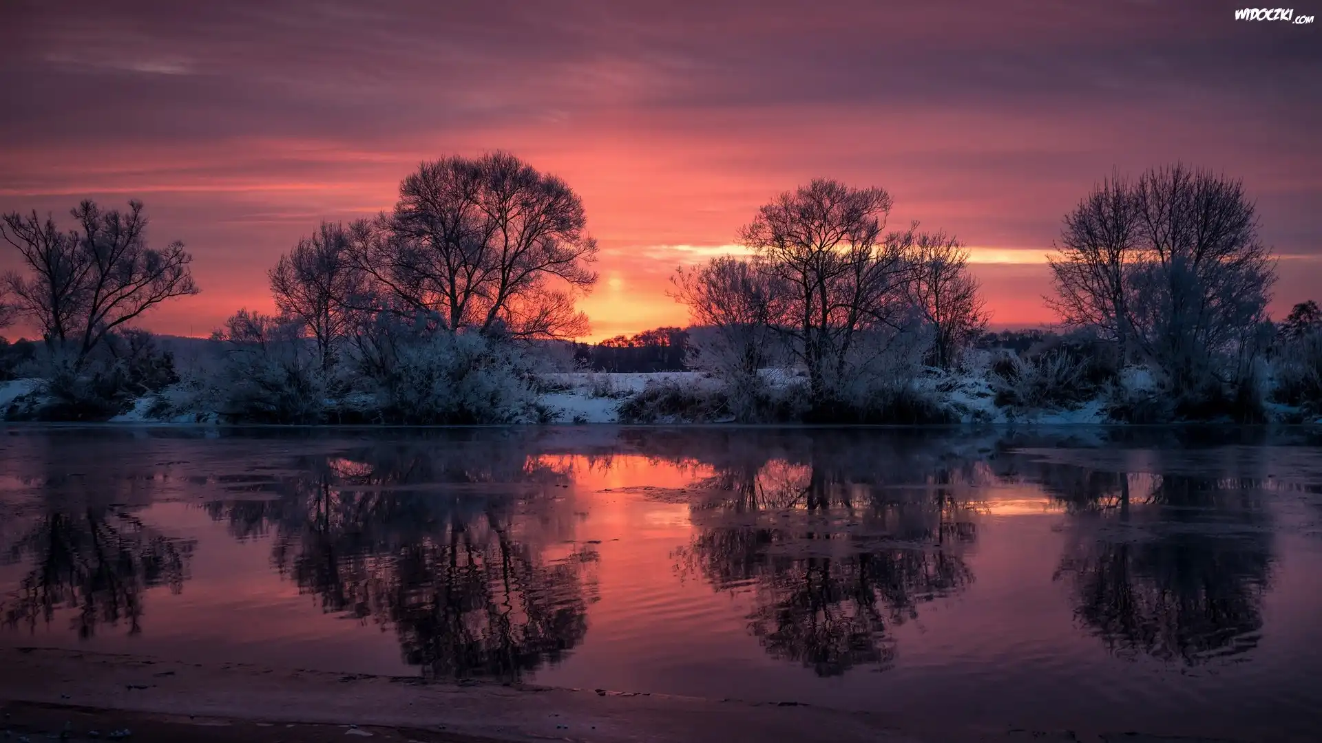 Zdjęcia, Zima, Rzeka, Drzewa, Odbicie, Zachód słońca